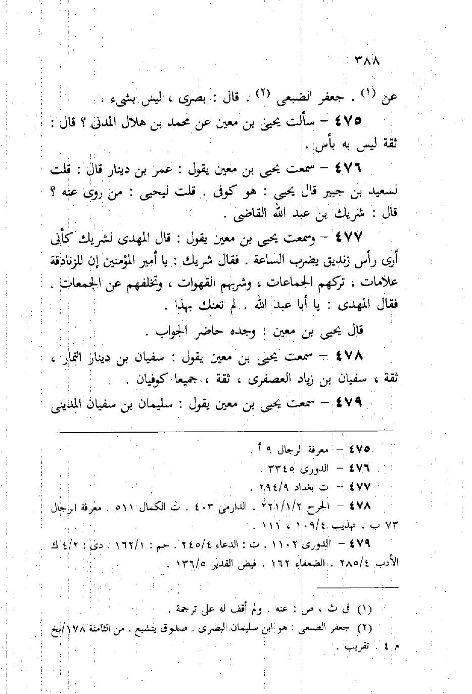 (476) سمعت يحيى بن معين يقول: «عمر بن دينار، قال: قلت لسعيد بن جبير ... » قال يحيى: «هو كوفي» ، قلت ليحيى: من روى عنه؟ قال: «شريك بن عبد الله القاضي» .