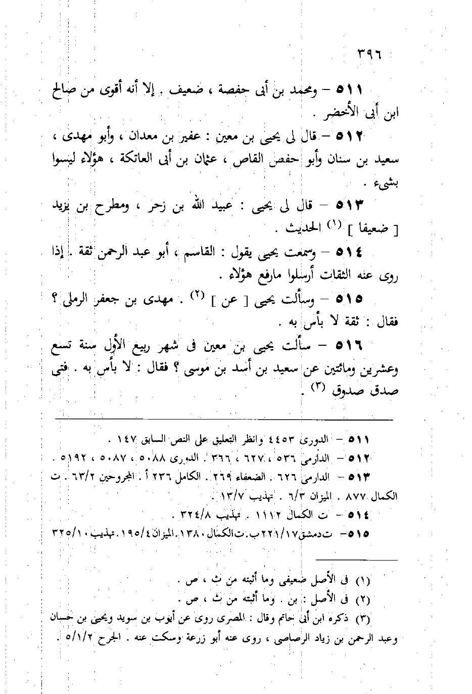 (512) قال لي يحيى بن معين: «عفير بن معدان، وأبو مهدي سعيد بن سنان، وأبو حفص القاص عثمان بن أبي العاتكة؛ هؤلاء ليسوا بشيء» .