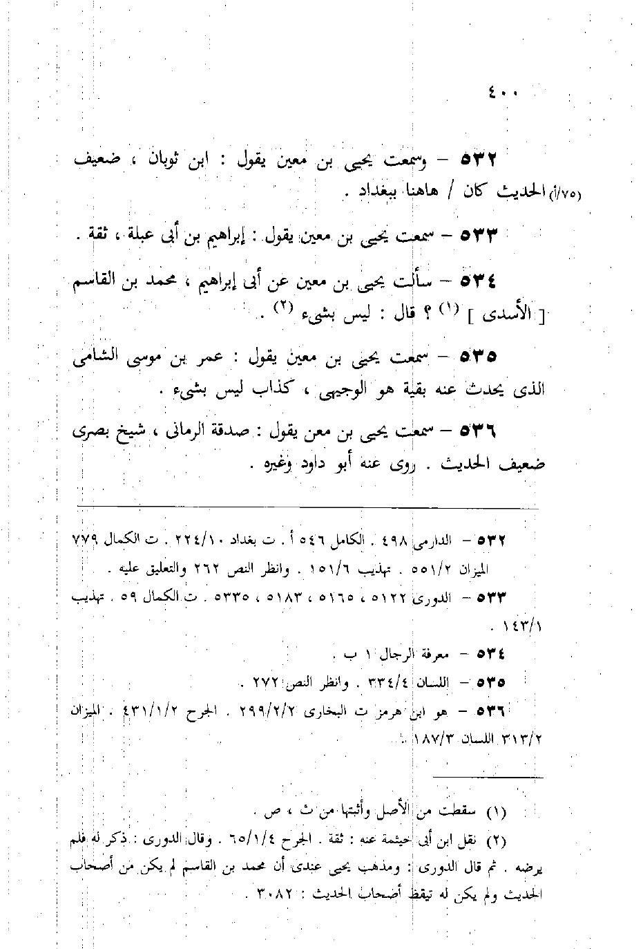 (532) وسمعت يحيى بن معين يقول: «ابن ثوبان ضعيف الحديث، كان هاهنا ببغداد» .