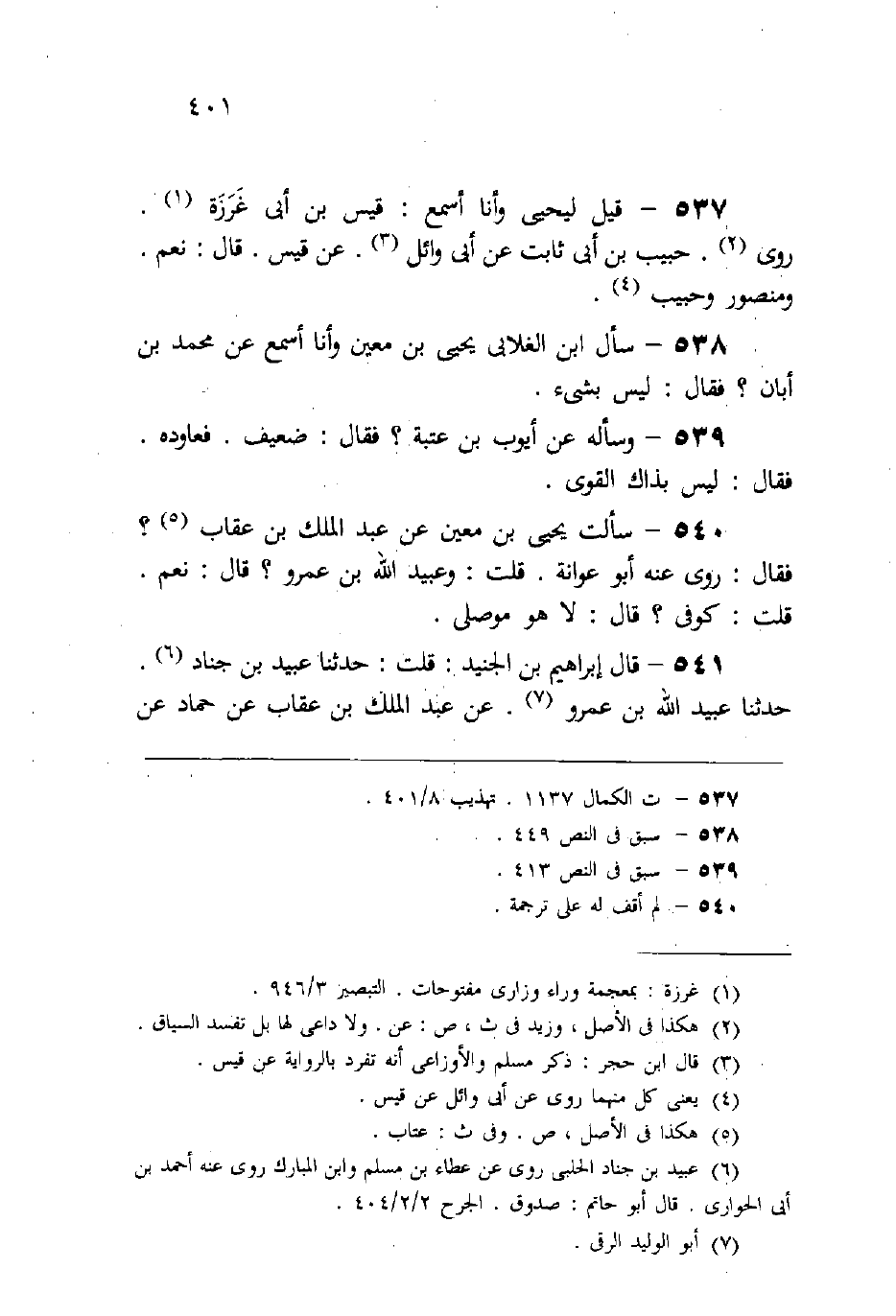 (540) سألت يحيى عن عبد الملك بن عقاب، فقال: «روى عنه أبو عوانة» ، قلت: وعبيد الله بن عمرو؟ قال: «نعم» ، قلت: كوفي؟ قال: «لا، هو موصلي» .