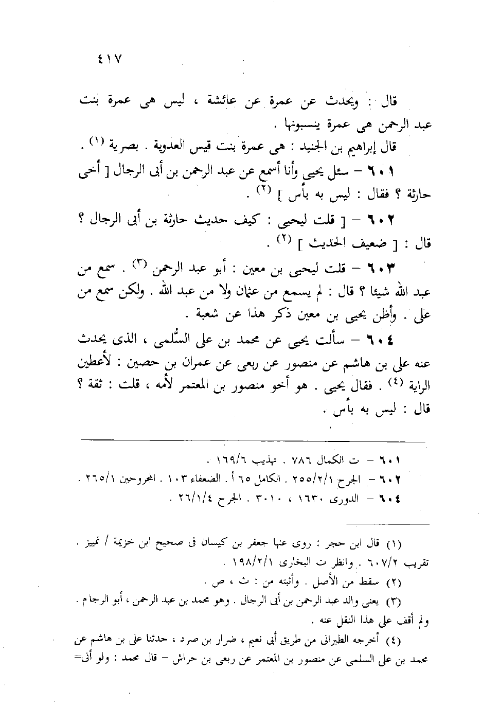 (601) سئل يحيى وأنا أسمع عن عبد الرحمن بن أبي الرجال أخي حارثة، فقال: «ليس به بأس» .