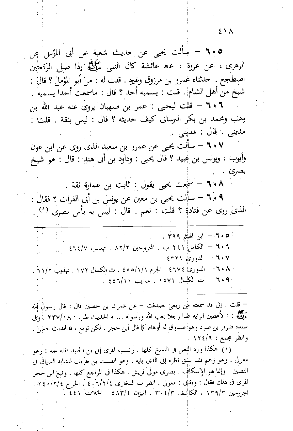 (605) سألت يحيى عن حديث شعبة، عن أبي المؤمل، عن الزهري، عن عروة، عن عائشة: كان النبي -صلى الله عليه وسلم- إذا صلى الركعتين اضطجع، حدثناه عمرو بن مرزوق وغيره، قلت له: من أبو المؤمل؟ قال: «شيخ من أهل الشام» ، قلت: يسميه أحد؟ قال: «ما سمعت أحدًا يسميه» .