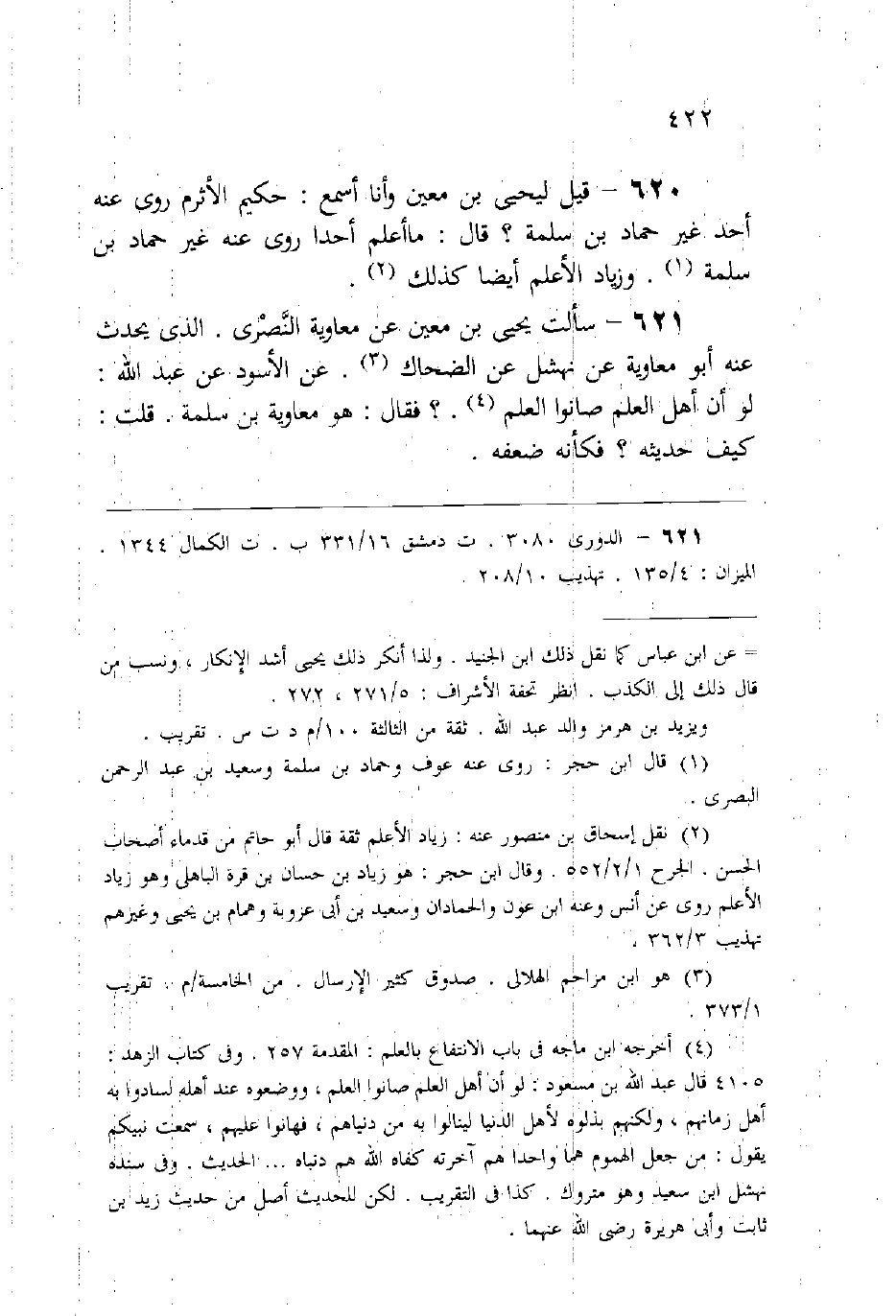 (620) قيل ليحيى بن معين وأنا أسمع: حكيم الأثرم روى عنه أحد غير حماد بن سلمة؟ قال: «ما أعلم أحدًا روى عنه غير حماد بن سلمة، وزياد الأعلم أيضًا كذلك» .