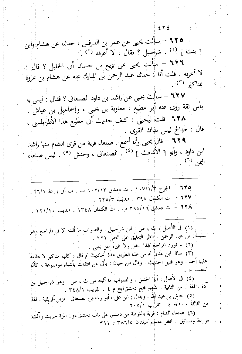 (629) قال يحيى وأنا أسمع: «صنعاء قرية من قرى الشام، منها راشد ابن داود، وأبو الأشعث الصنعاني، وحنش، ليس صنعاء اليمن» .