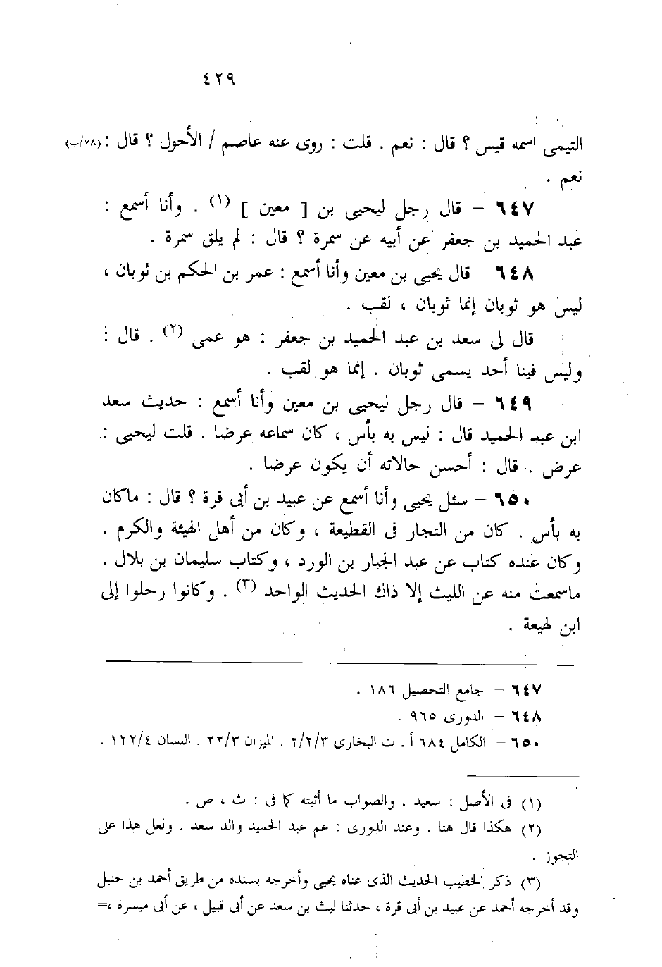 (649) قال رجل ليحيى بن معين وأنا أسمع: حديث سعد بن عبد الحميد؟ قال: «ليس به بأس، كان سماعه عرضًا» ، قلت ليحيى: عرض؟ قال: «أحسن حالاته أن يكون عرضًا» .