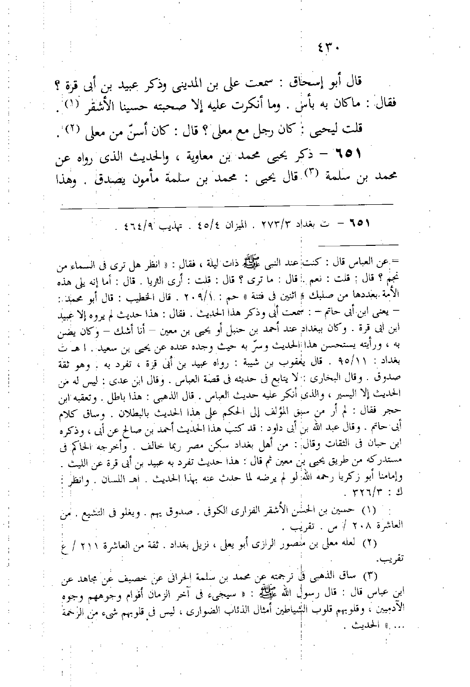 (651) ذكر يحيى محمد بن معاوية، والحديث الذي رواه عن محمد بن سلمة، قال يحيى: «محمد بن سلمة مأمون يصدق، وهذا