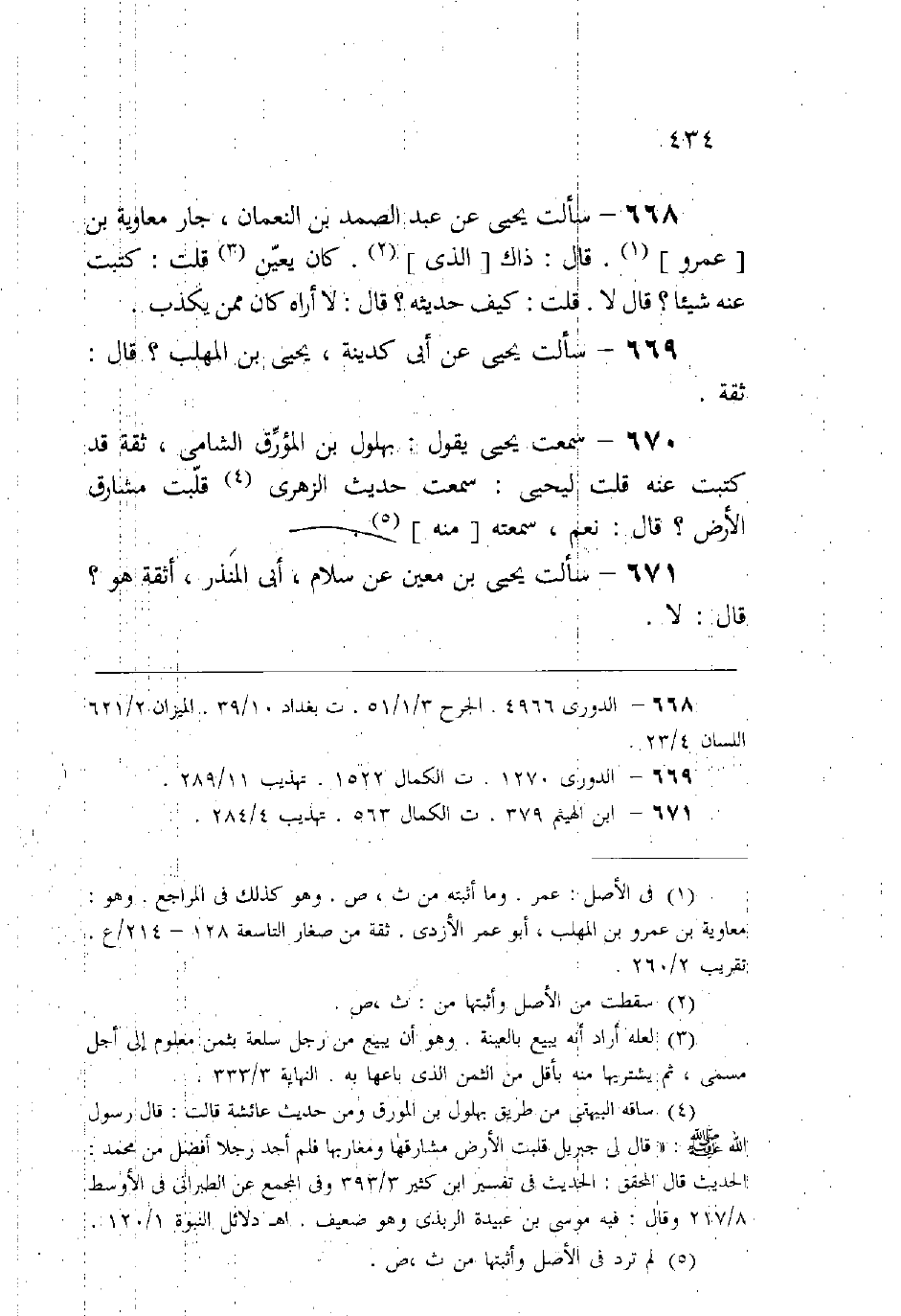 (670) سمعت يحيى يقول: «بهلول بن المؤرق الشامي ثقة، قد كتبت عنه» ، قلت ليحيى: سمعت حديث الزهري: «قلبت مشارق الأرض» ؟ قال: «نعم، سمعته منه» .