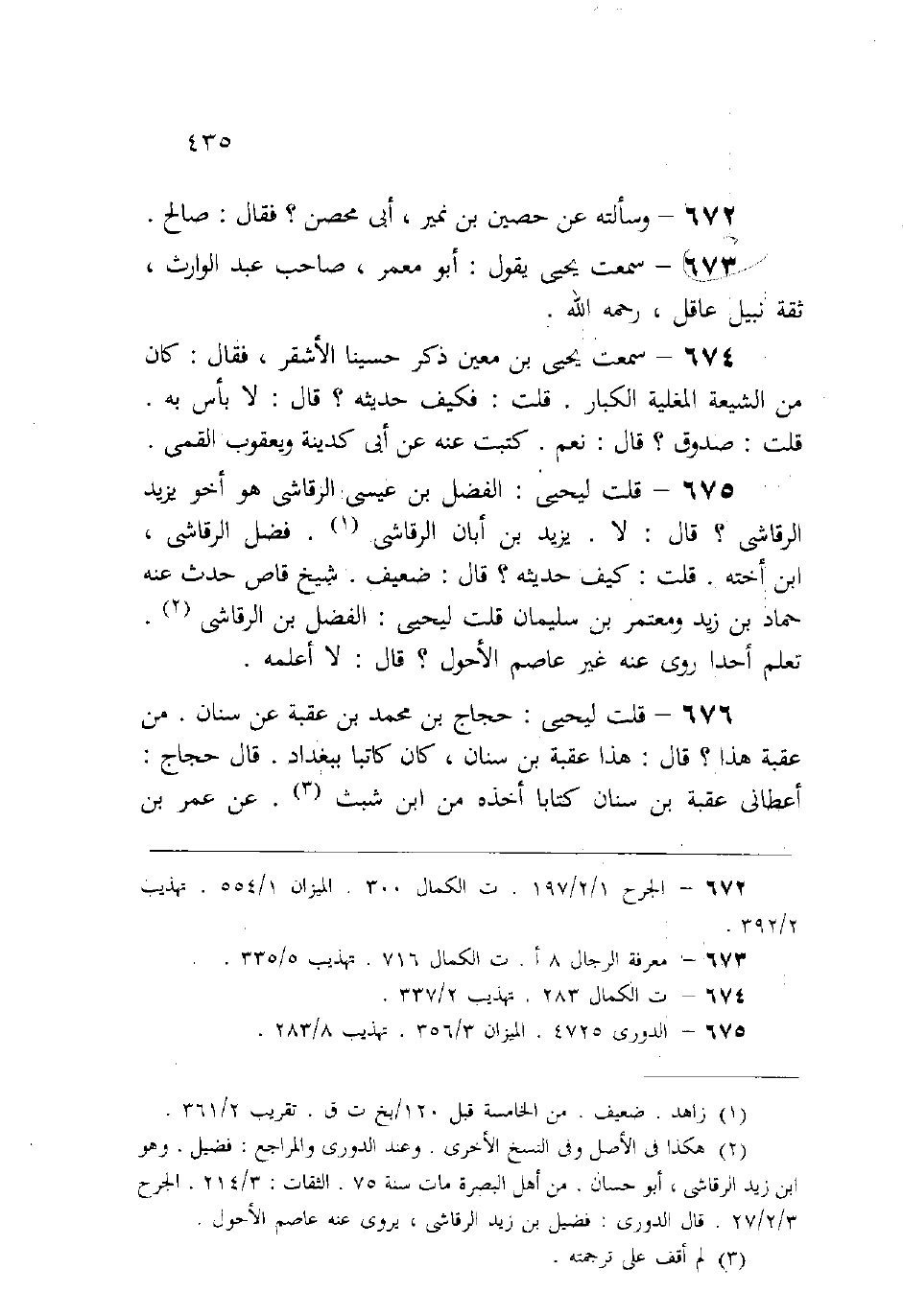 (674) سمعت يحيى بن معين ذكر حسينًا الأشقر، فقال: «كان من الشيعة المغلية الكبار» ، قلت: فكيف حديثه؟ قال: «لا بأس به» ، قلت: صدوق؟ قال: «نعم، كتبت عنه عن أبي كدينة ويعقوب القمي» .