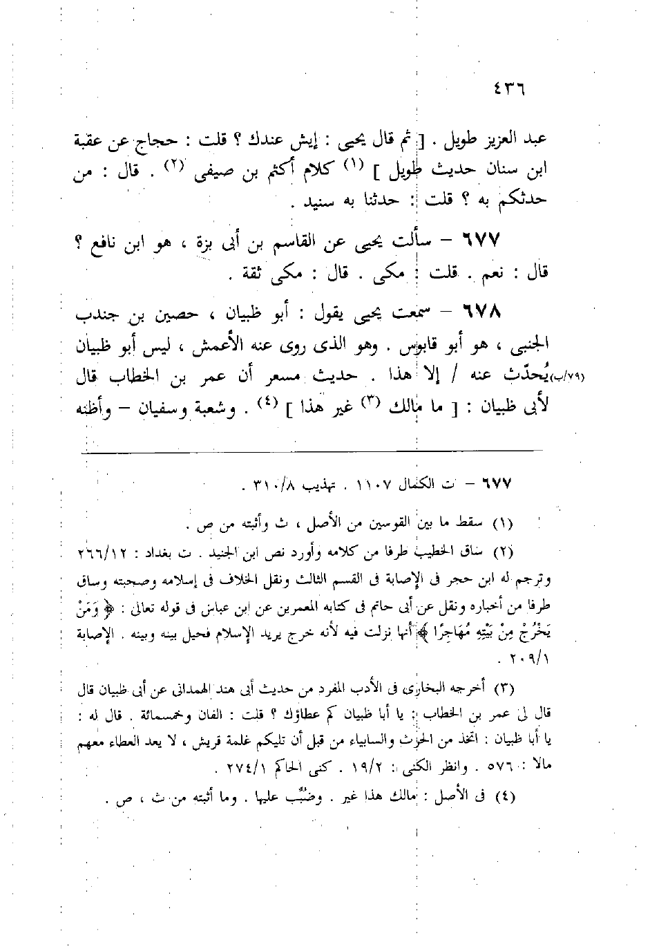 (678) سمعت يحيى يقول: «أبو ظبيان حصين بن جندب الجنبي هو أبو قابوس، وهو الذي روى عنه الأعمش، ليس أبو ظبيان يحدث عنه إلا هذا. حديث مسعر أن عمر بن الخطاب قال لأبي ظبيان: (ما مالك غير هذا؟) ، وشعبة وسفيان -وأظنه