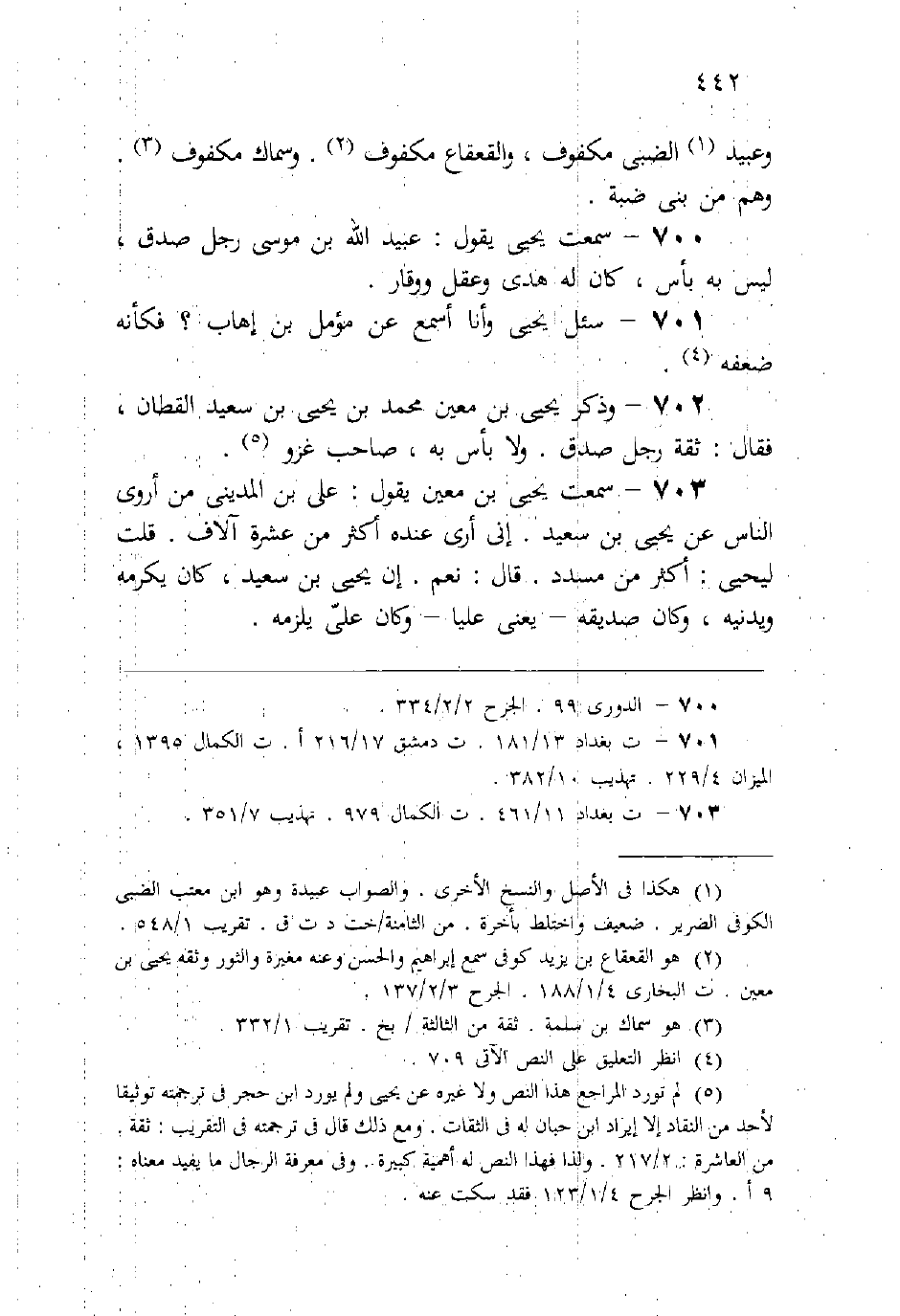 (700) سمعت يحيى يقول: «عبيد الله بن موسى رجل صدق، ليس به بأس، كان له هدى وعقل ووقار» .