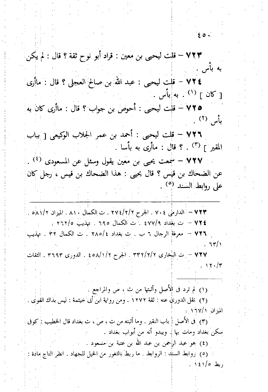 (727) سمعت يحيى بن معين يقول -وسئل عن المسعودي، عن الضحاك بن قيس-، قال يحيى: «هذا الضحاك بن قيس رجل كان على روابط السند» .