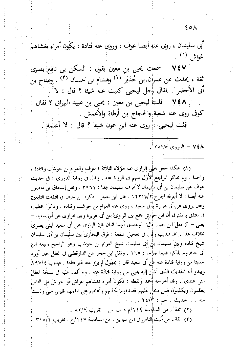 (747) سمعت يحيى بن معين يقول: «السكن بن نافع بصري ثقة، يحدث عن عمران بن حدير وهشام بن حسان وصالح بن أبي الاخضر» ، فقال رجل ليحيى: كتبت عنه شيئًا؟ قال: «لا» .