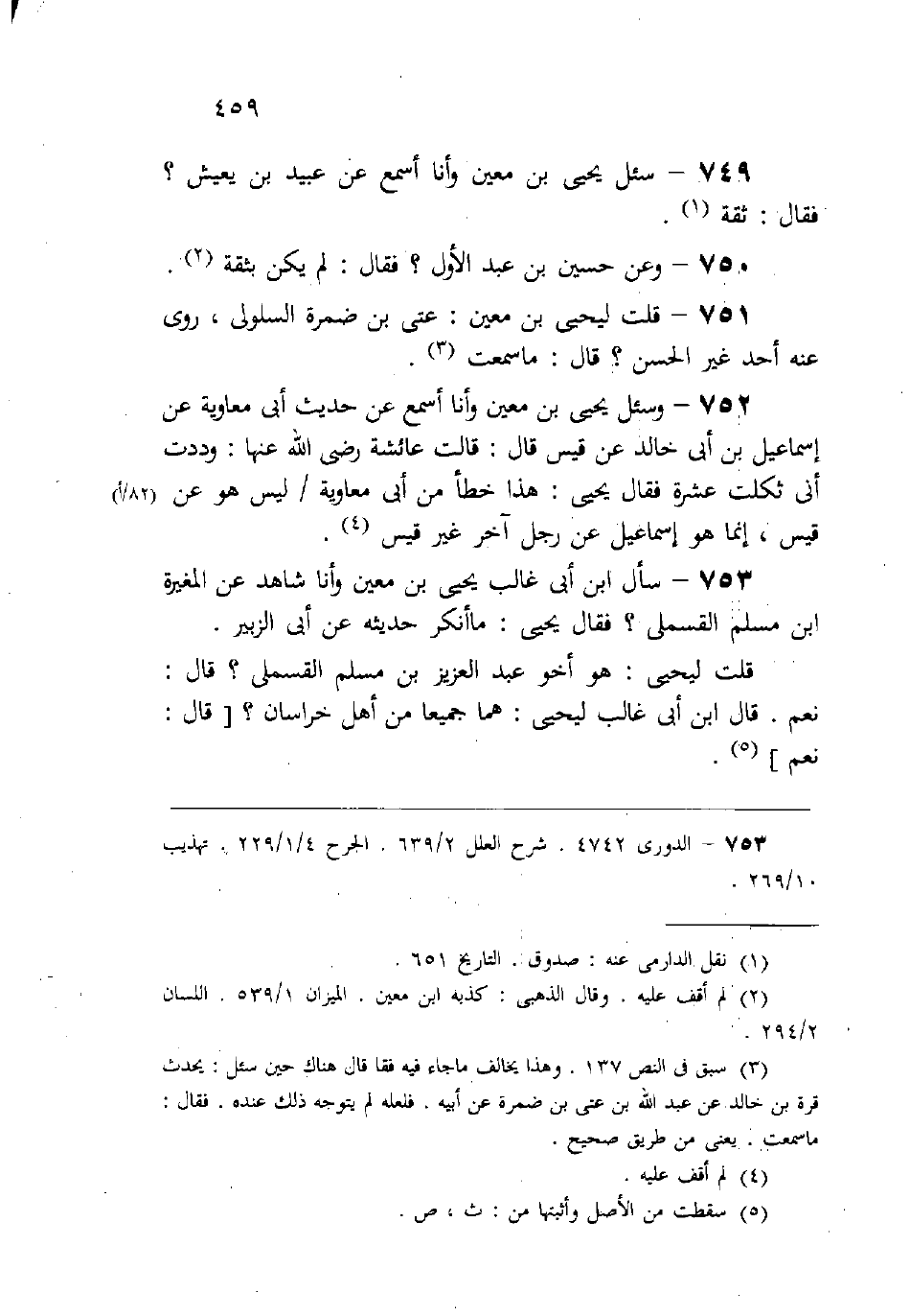 (752) وسئل يحيى بن معين وأنا أسمع عن حديث أبي معاوية، عن إسماعيل بن أبي خالد، عن قيس، قال: قالت عائشة -رضي الله عنها-: (وددت أني ثكلت عشرة) ، فقال يحيى: «هذا خطأ من أبي معاوية، ليس هو عن قيس، إنما هو إسماعيل عن رجل آخر غير قيس» .