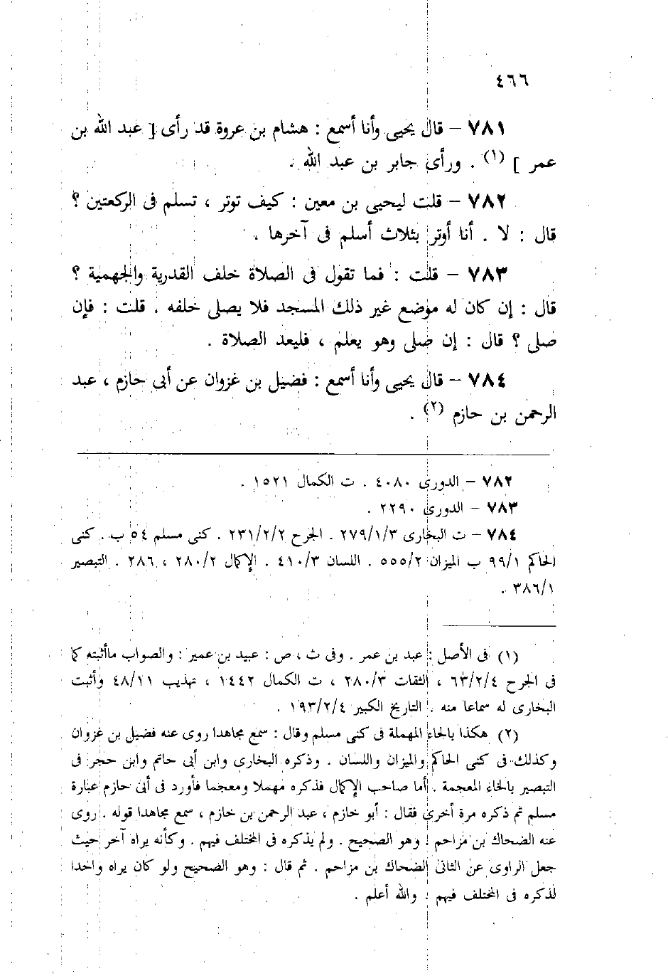 (782) قلت ليحيى بن معين: كيف توتر؟ تسلم في الركعتين؟ قال: «لا، أنا أوتر بثلاث، أسلم في آخرها» .