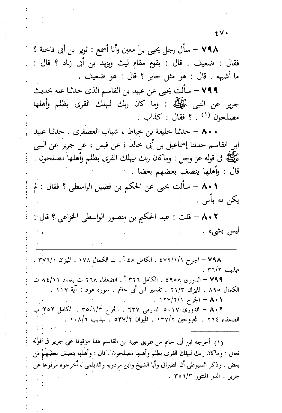 (799) سألت يحيى عن عبيد بن القاسم، الذي حدثنا عنه بحديث جرير عن النبي -صلى الله عليه وسلم-: {وما كان ربك ليهلك القرى بظلم وأهلها مصلحون} ، فقال: «كذاب» .