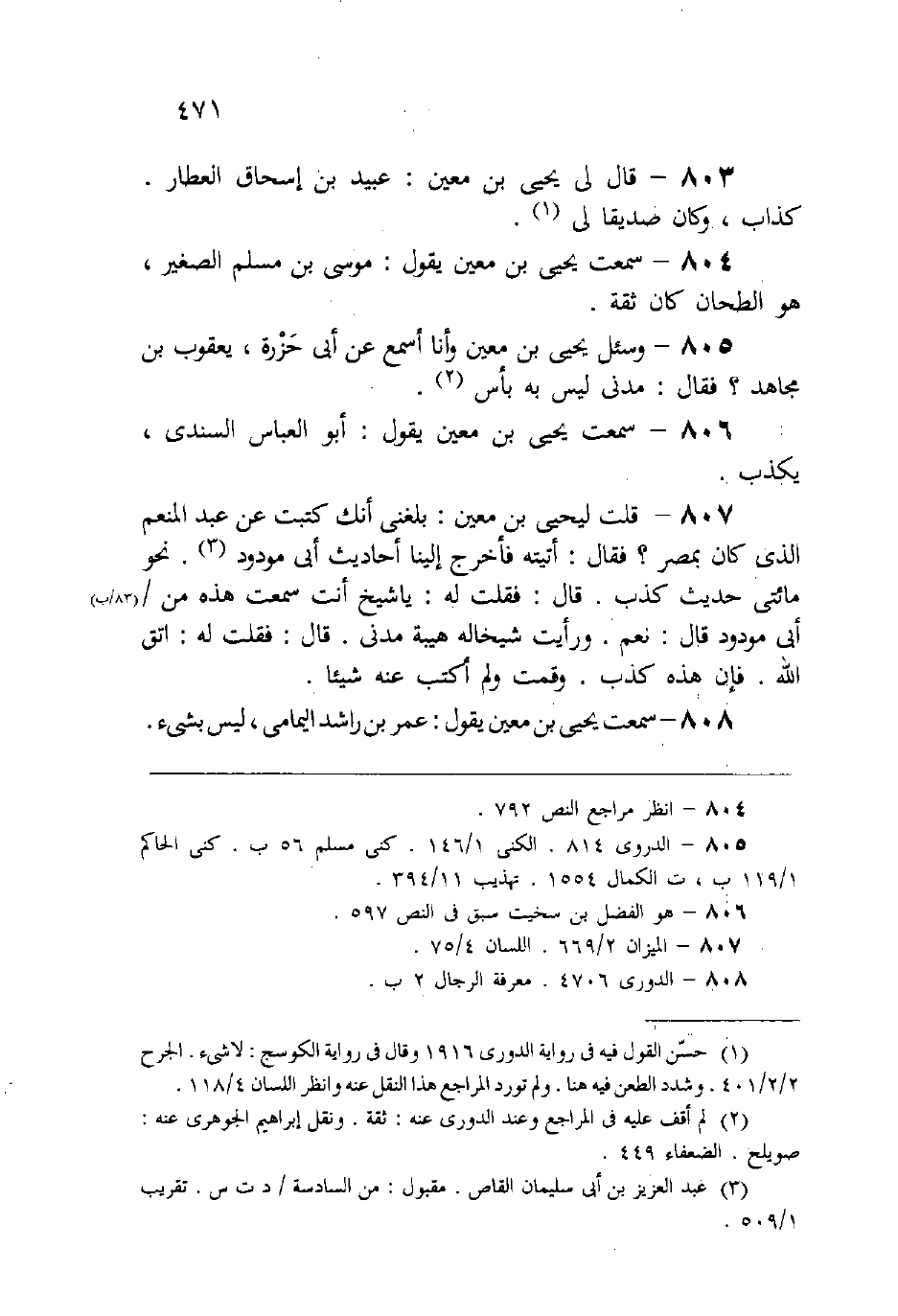 (807) قلت ليحيى بن معين: بلغني أنك كتبت عن عبد المنعم الذي كان بمصر؟ فقال: «أتيته، فأخرج إلينا أحاديث أبي مودود، نحو مائتي حديث كذب» ، قال: «فقلت له: يا شيخ، أنت سمعت هذه من أبي مودود؟ قال: (نعم، ورأيت شيخًا له هيبة مدني) » ، قال: «فقلت له: اتق الله، فإن هذه كذب، وقمت ولم أكتب عنه شيئًا» .