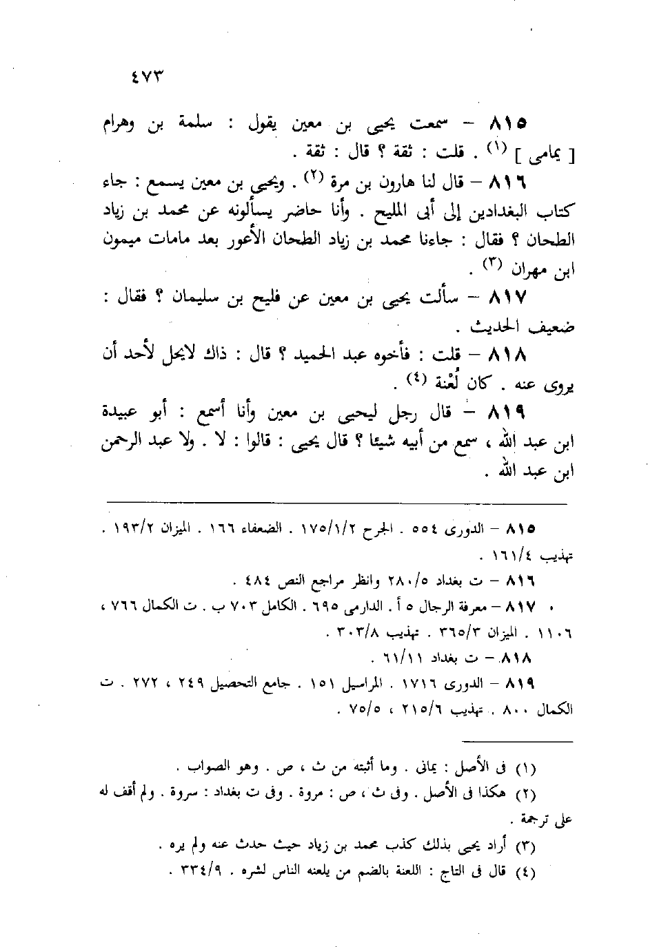 (815) سمعت يحيى بن معين يقول: «سلمة بن وهرام يمامي» ، قلت: ثقة؟ قال: «ثقة» .