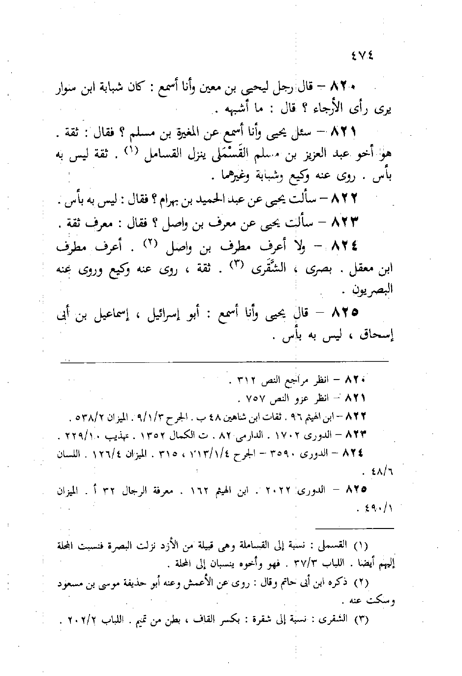 (821) سئل يحيى وأنا أسمع عن المغيرة بن مسلم؟ فقال: «ثقة، هو أخو عبد العزيز بن مسلم القسملي، ينزل القسامل، ثقة ليس به بأس، روى عنه وكيع وشبابة وغيرهما» .