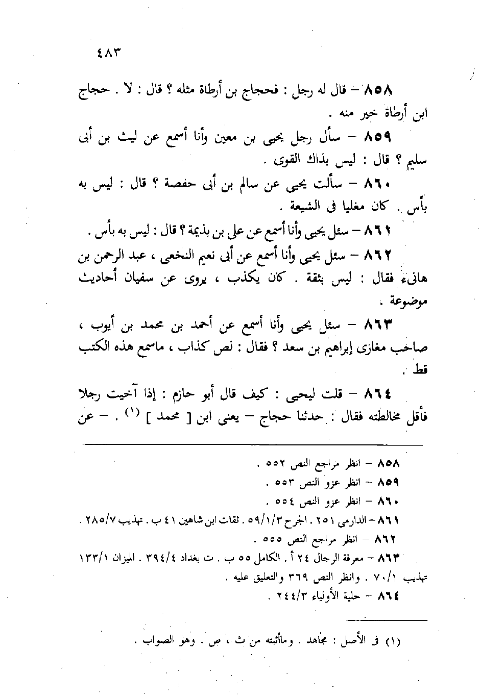 (858) قال له رجل: فحجاج بن أرطاة مثله؟ قال: «لا، حجاج بن أرطاة خير منه» .