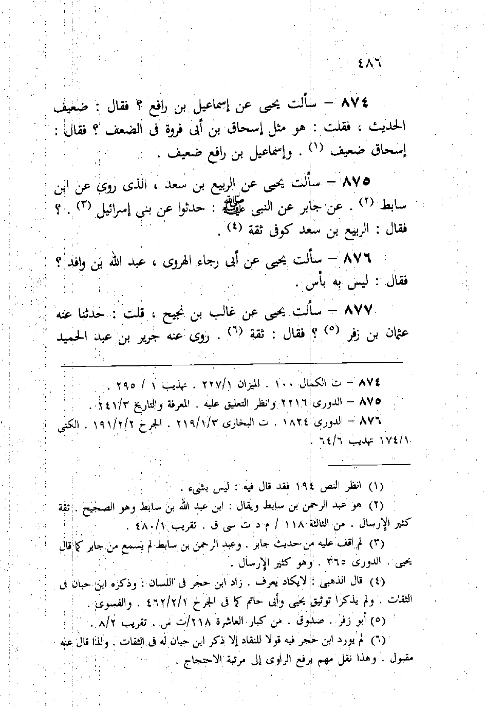 (875) سألت يحيى عن الربيع بن سعد الذي روى عن ابن سابط، عن جابر، عن النبي -صلى الله عليه وسلم-: «حدثوا عن بني إسرائيل» ، فقال: «الربيع بن سعد كوفي ثقة» .