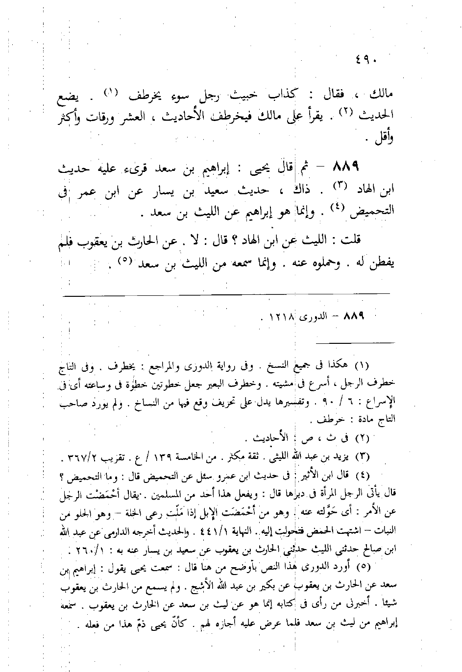 (889) ثم قال يحيى: «إبراهيم بن سعد قرئ عليه حديث ابن الهاد ذاك؛ حديث سعيد بن يسار، عن ابن عمر في التحميض، وإنما هو: إبرهيم، عن الليث بن سعد» ، قلت: الليث عن ابن الهاد؟ قال: «لا، عن الحارث بن يعقوب، فلم يفطن له، وحملوه عنه، وإنما سمعه من الليث بن سعد» .
