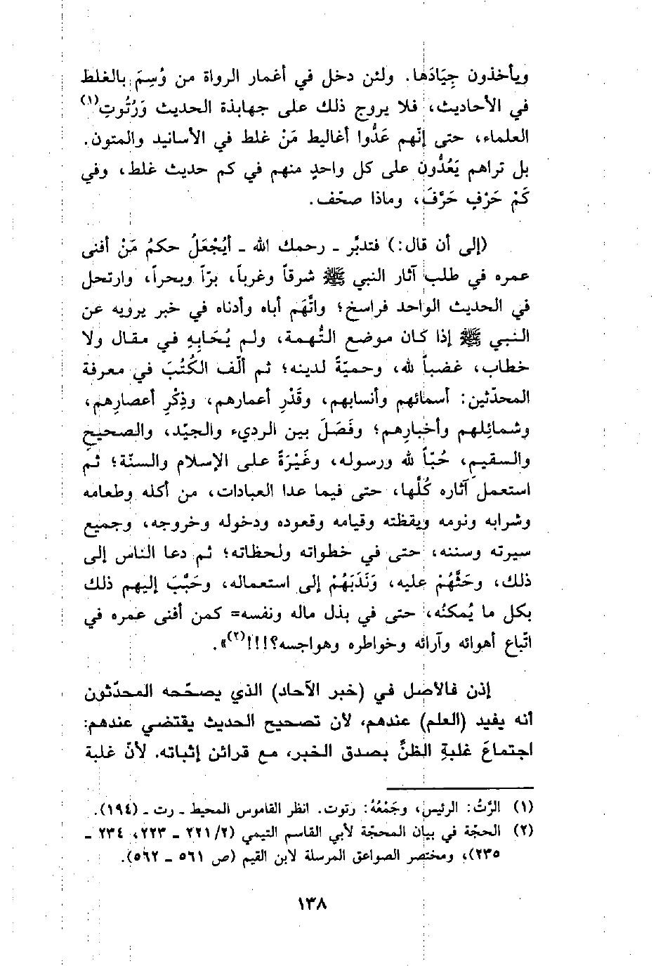 (إلى أن قال:) فتدبر ـ رحمك الله ـ أيجعل حكم من أفنى عمره في طلب آثار النبي صلى الله عليه وسلم شرقاً وغرباً، براً وبحراً، وارتحل في الحديث الواحد فراسخ؛ واتهم أباه وأدناه في خبر يرويه عن النبي صلى الله عليه وسلم إذا كان موضع التهمة، ولم يحابه في مقال ولا خطاب، غضباً لله، وحميةً لدينه؛ ثم ألف الكتب في معرفة المحدثين: أسمائهم وأنسابهم، وقدر أعمارهم، وذكر أصارهم، وشمائلهم وأخبارهم؛ وفصل بين الرديء والجيد، والصحيح والسقيم، حباً لله ورسوله، وغيرةً على الإسلام والسنة؛ ثم استعمل آثاره كلها، حتى فيما عدا العبادات، من أكله وطعامه وشرابه ونومه ويقظته وقيامه وقعوده ودخوله وخروجه، وجميع سيرته وسننه، حتى في خطواته ولحظاته؛ ثم دعا الناس إلى ذلك، وحثهم عليه، وندبهم إلى استعماله، وحبب إليهم ذلك بكل ما يمكنه، حتى في بذلك ماله ونفسه = كمن أفنى عمره في أتباع أهوائه وآرائه وخواطره وهواجسه؟!!! (¬2)) .