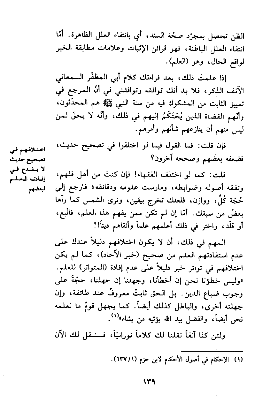 المهم في ذلك، أن لا يكون اختلافهم دليلاً عندك على عدم استفادتهم العلم من صحيح (خبر الآحاد) ، كما لم يكن اختلافهم في تواتر خبر دليلاً على عدم إفادة (المتواتر) للعلم. ((وليس خطؤنا نحن إن أخطأنا، وجهلنا إن جهلنا، حجة على وجوب ضياع الدين. بل الحق ثابت معروف عند طائفة، وإن جهلته أخرى، والباطل كذلك أيضاً. كما يجهل قوم ما نعلمه نحن أيضاً، والفضل بيد الله يؤتيه من يشاء)) (¬1) .