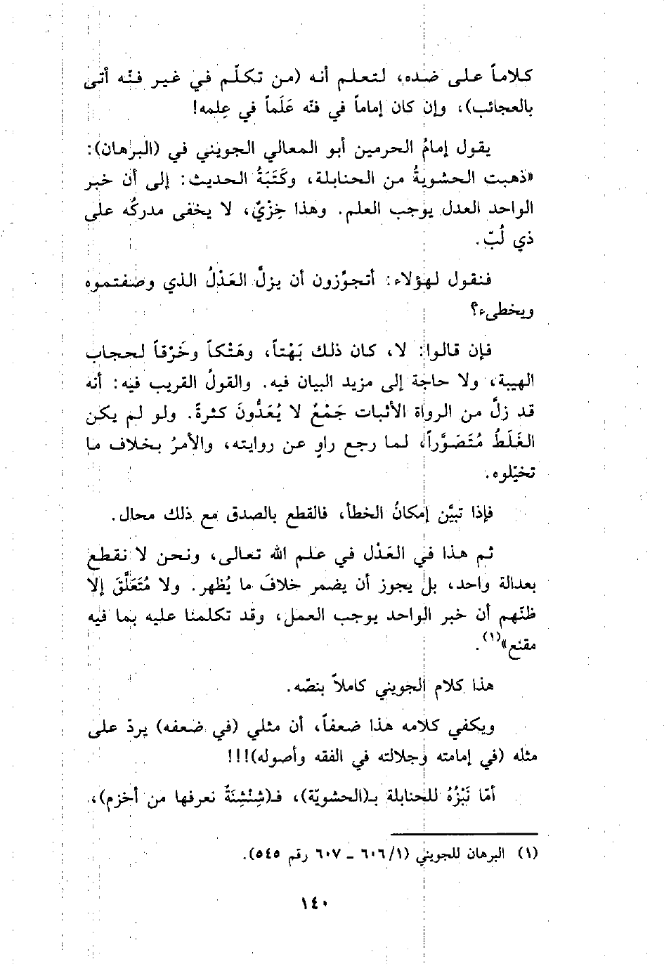 يقول إمام الحرمين أبو المعالي الجويني في (البرهان) : ((ذهبت الحشوية من الحنابلة، وكتبة الحديث: إلى أن خبر الواحد العدل يوجب العلم. وهذا خزي، لا يخفى مدركه على ذي لب.