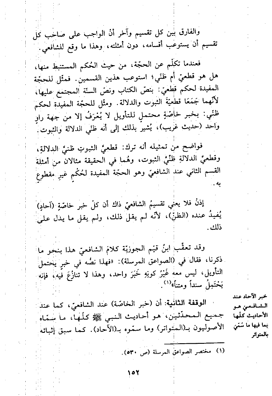 والدلالة. ومثل لحجة المفيدة لحكم ظني: بخبر خاصةٍ محتملٍ للتأويل لا يعرف إلا من جهة راوٍ واحد (حديث غريب) ، يشير بذلك إلى أنه ظني الدلالة والثبوت. فواضح من تمثيله أنه ترك: قطعي الثبوت ظني الدلالة، وقطعي الدلالة ظني الثبوت، وهما في الحقيقة مثالاان من أمثلة القسم الثاني عند الشافعي وهو الحجة المفيدة لحكمٍ غير مقطوع به.