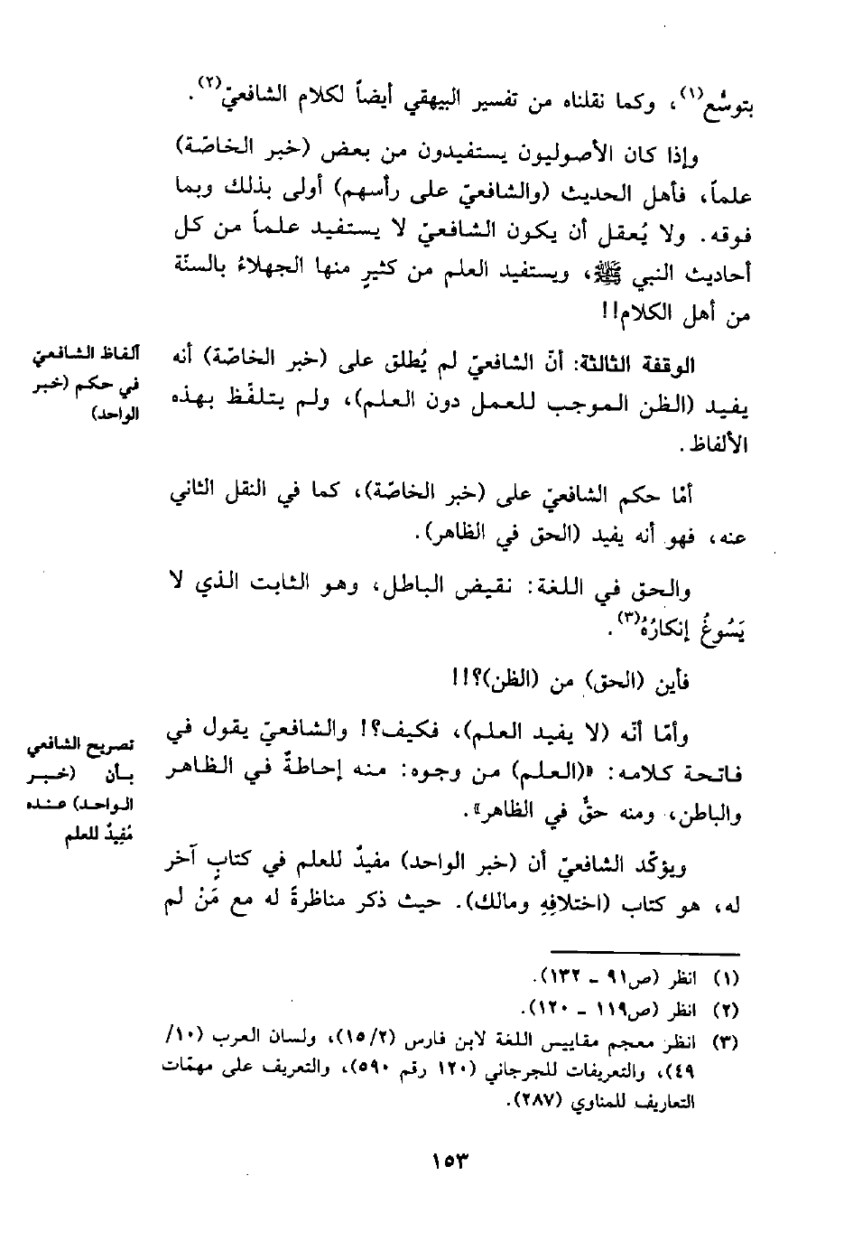 وإذا كان الأصوليون يستفيدون من بعض (خبر الخاصة) علماً، فأهل الحديث (والشافعي على رأسهم) أولى بذلك وبما فوقه. ولا يعقل أن يكون الشافعي لا يستفيد علماً من كل أحاديث النبي صلى الله عليه وسلم، ويستفيد العلم من كثيرٍ منها الجهلاء بالسنة من أهل الكلام!!