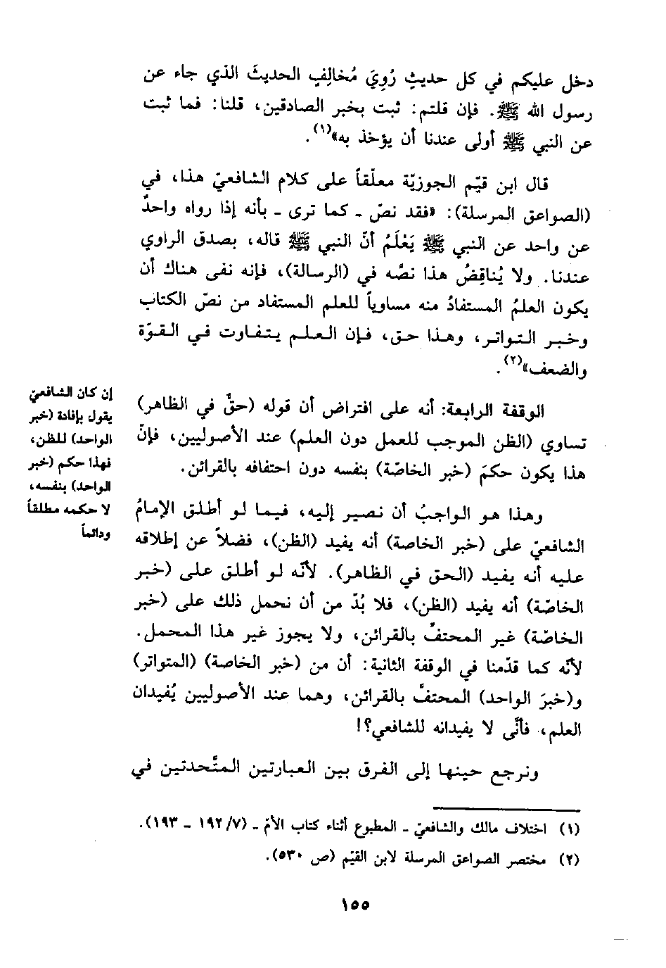 وهذا هو الواجب أن نصير إليه، فيمالو أطلق الإمام الشافعي على (خبر الخاصة) أنه يفيد (الظن) ، فضلاً عن إطلاقه عليه أنه يفيد (الحق في الظاهر) . لأنه لو أطلق على (خبر الخاصة) غير المحتف بالقرائن، ولا يجوز غير هذا المحمل. لأنه كما قدمنا في الوقفة الثانية: أن من (خبر الخاصة) (المتواتر) و (خبر الواحد) المحتف بالقرائن، وهما عند الأصوليين يفيدان العلم، فأنى لا يفيدانه للشافعي؟!