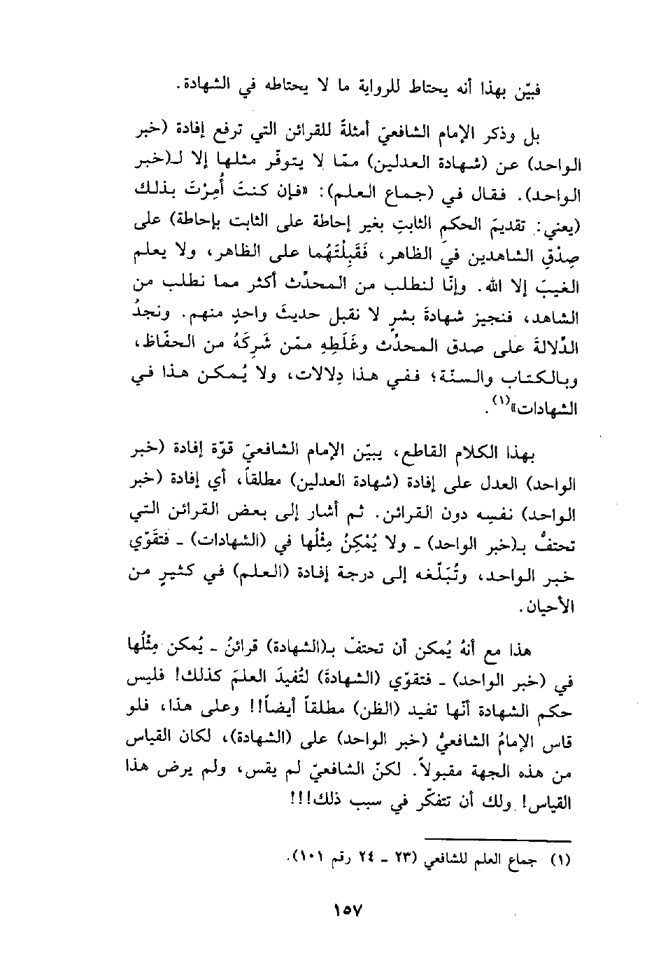 هذا مع أنه يكن أن تحتف بـ (الشهادة) قرائن ـ يمكن مثلها في (خبر الواحد) ـ فتقوي (الشهادة) لتفيد العلم كذلك! فليس حكم الشهادة أنها تفيد (الظن) مطلقاً أيضاً!! وعلى هذا، فلو قاس الإمام الشافعي (