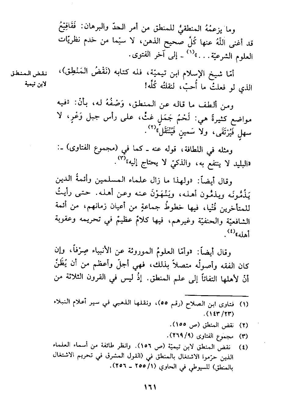 (¬4) نقض المنطق لابن تيمية (ص 156) . وانظر طائفة من أسماء العلماء الذين حرموا الاشتغال بالمنطق في (القول المشرق في تحريم الاشتغال بالمنطق) للسيوطي في الحاوي (1/255ـ 256) .