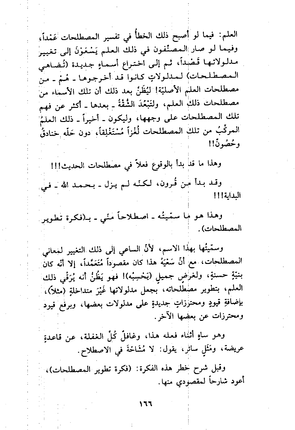 العلم: فيما لو أصبح ذلك الخطأ في تفسير المصطلحات عمداً، وفيما لو صار المصنفون في ذلك العلم يسعون إلى تغيير مدلولاتها قصداً، ثم إلى اختراع أسماءٍ جديدة (تضاهي المصطلحات) لمدلولاتٍ كانوا قد أخرجوها ـ هم ـ من مصطلحات العلم الأصلية! ليظن بعد ذلك أن تلك الأسماء من مصطلحات ذلك العلم، ولتبعد الشقة ـ بعدها ـ أكثر عن فهم تلك المصطلحات على وجهها، وليكون ـ أخيراً ـ ذلك العلم المركب من تلك المصطلحات لغزاً مستغلقاً، دون حله خنادق وحصون!!