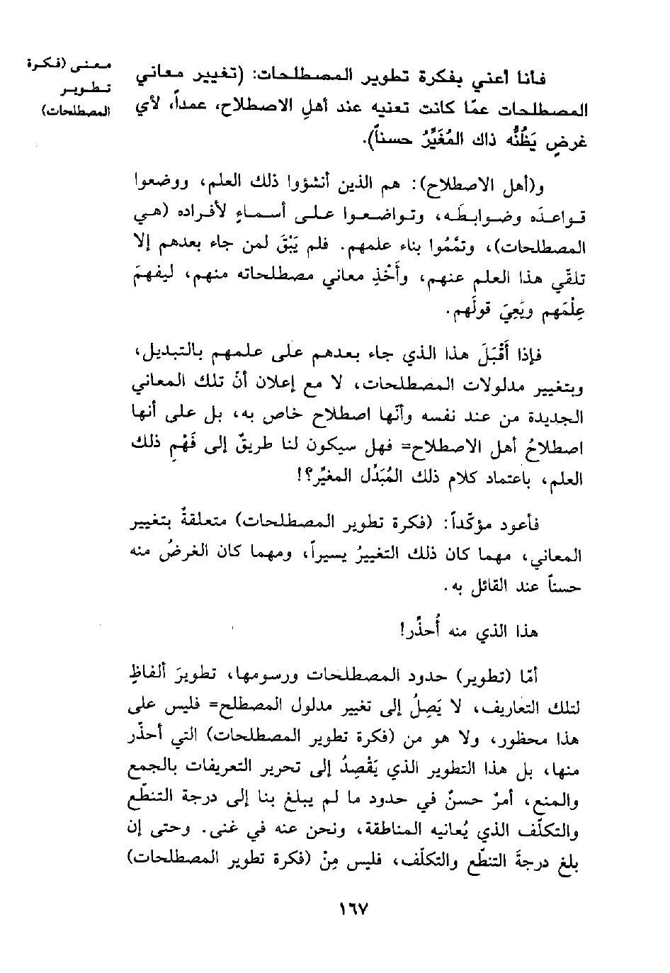 أما (تطوير) حدود المصطلحات ورسومها، تطوير ألفاظٍ لتلك التعاريف، لا يصل إلى تغيير مدلول المصطلح = فليس على هذا محظور، ولا هو من (فكرة تطوير المصطلحات) التي أحذر منها، بل هذا التطوير الذي يقصد إلى تحرير التعريفات بالجمع والمنع، أمر حسن في حدود ما لم يبلغ بنا إلى درجة التنطع والتكلف الذي يعانيه المناطقة، ونحن عنه في غنى. وحتى إن بلغ درجة التنطع والتكلف، فليس من (فكرة تطوير المصطلحات)