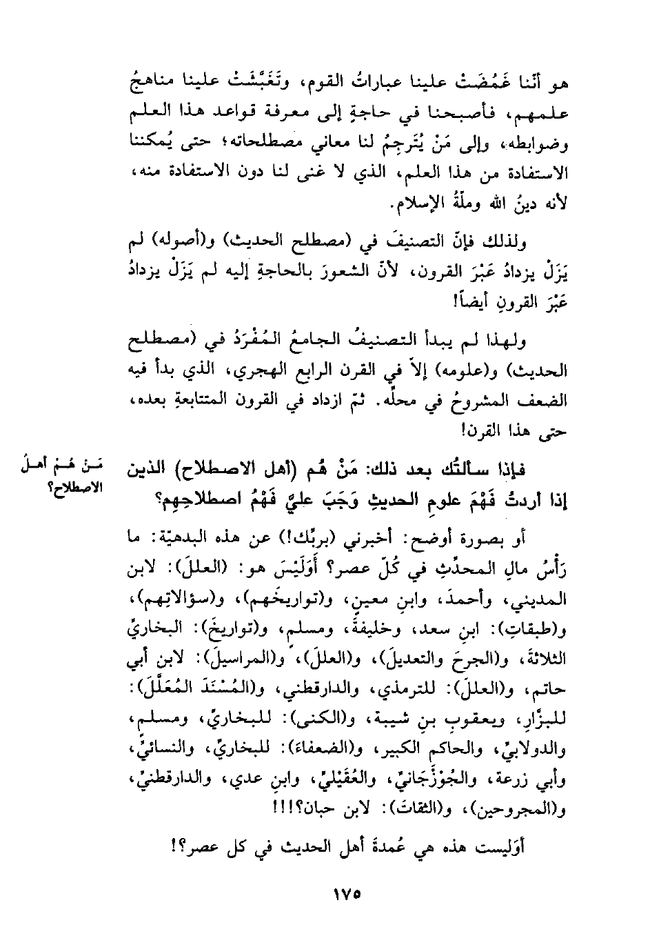 أو بصورة أوضح: أخبرني (بربك) عن هذه البدهية: ما رأس مال المحدث في كل عصر؟ أوليس هو: (العلل) : لابن المديني، وأحمد، وابن معين، و (تواريخهم) ، و (سؤالاتهم) ، و (طبقات) : ابن سعد، وخليفة، ومسلمٍ، و (تواريخ) : البخاري الثلاثة، و (الجرح والتعديل) ، و (العلل) ، و (المراسيل) : لابن أبي حاتم، و (العلل) : للترمذي، والدارقطني، و (المسند المعلل) : للبزار، ويعقوب بن شيبة، و (الكني) : للبخاري، ومسلم، والدولابي، والحاكم الكبير، و (الضعفاء) : للبخاري، والنسائي، وأبي زرعة، والجوزجاني، والعقيلي، وابن عدي، والدارقطني، و (المجروحين) ، و (الثقات) : لابن حبان؟