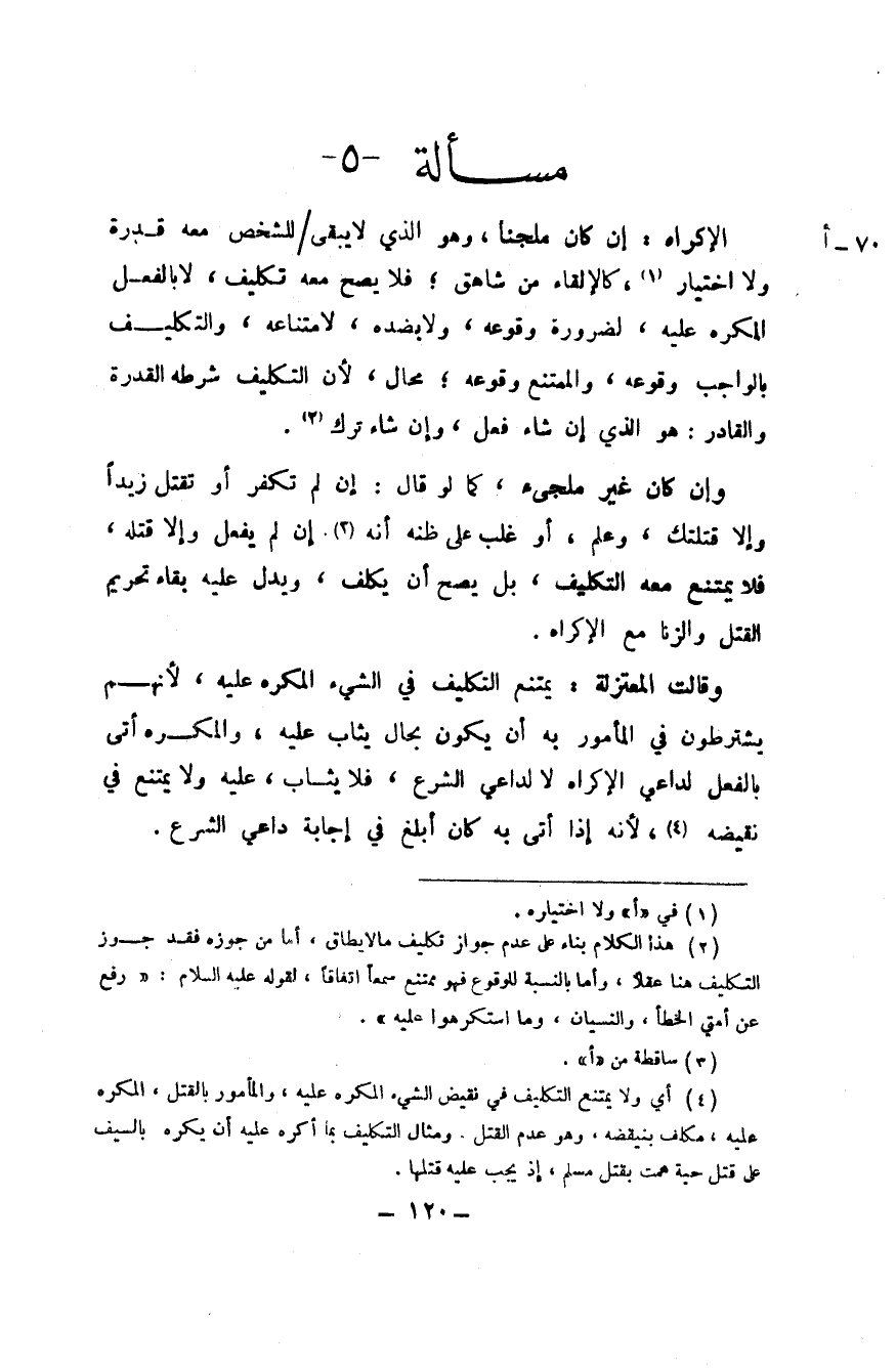 وَقَالَت الْمُعْتَزلَة يمْتَنع التَّكْلِيف فِي الشَّيْء الْمُكْره عَلَيْهِ لأَنهم يشترطون فِي الْمَأْمُور بِهِ أَن يكون بِحَال يُثَاب عَلَيْهِ وَالْمكْره أَتَى بِالْفِعْلِ لداعي الْإِكْرَاه لَا لداعي الشَّرْع فَلَا يُثَاب عَلَيْهِ وَلَا يمْتَنع فِي نقيضة لِأَنَّهُ إِذا أَتَى بِهِ كَانَ أبلغ فِي إِجَابَة دَاعِي الشَّرْع