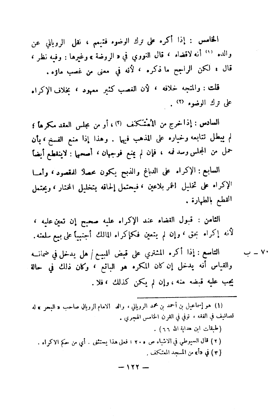 الْخَامِس إِذا أكره على ترك الْوضُوء فَتَيَمم نقل الرَّوْيَانِيّ عَن وَالِده أَنه لاقضاء قَالَ النَّوَوِيّ فِي الرَّوْضَة وَغَيرهَا وَفِيه نظر قَالَ لَكِن الرَّاجِح مَا ذكره لِأَنَّهُ فِي معنى من غصب مَاؤُهُ