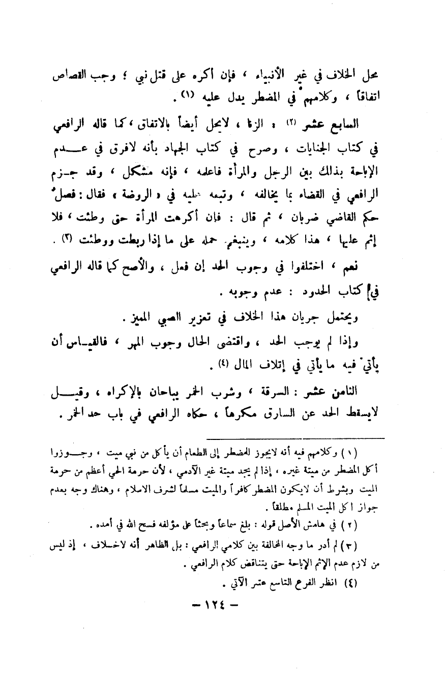 السَّابِع عشر الزِّنَا لَا يحل أَيْضا بالِاتِّفَاقِ كَمَا قَالَه الرَّافِعِيّ فِي كتاب الْجِنَايَات وَصرح فِي كتاب الْجِهَاد بِأَنَّهُ لَا فرق فِي عدم الْإِبَاحَة بذلك بَين الرجل وَالْمَرْأَة فاعلمه فَإِنَّهُ مُشكل وَقد جزم الرَّافِعِيّ فِي الْقَضَاء بِمَا يُخَالِفهُ وَتَبعهُ عَلَيْهِ فِي الرَّوْضَة فَقَالَ فصل حكم القَاضِي ضَرْبَان ثمَّ قَالَ فَإِن أكرهت الْمَرْأَة حَتَّى وطِئت فَلَا إِثْم عَلَيْهَا هَذَا كَلَامه وَيَنْبَغِي حمله على مَا إِذا ربطت ووطئت