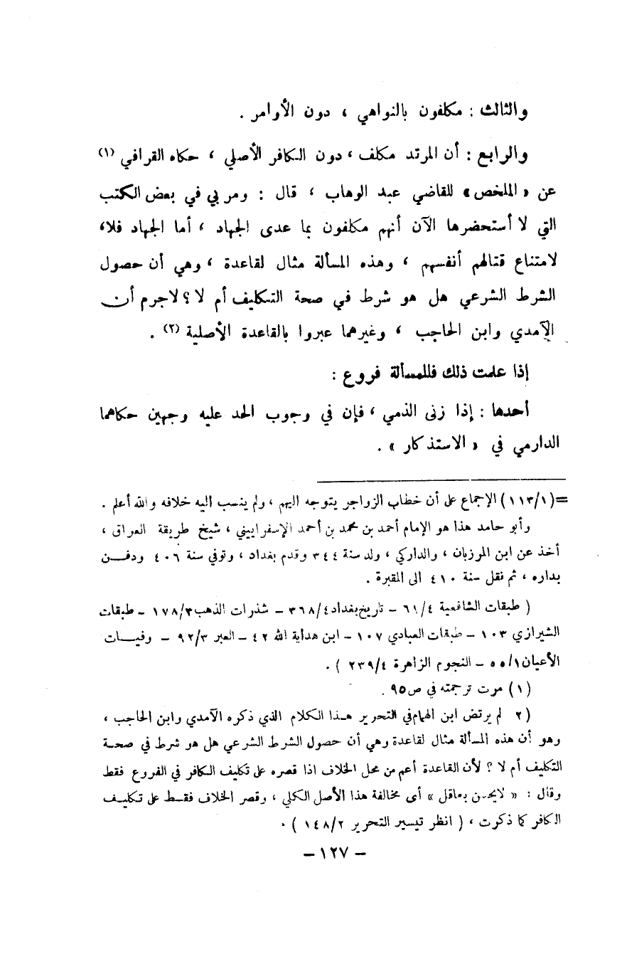وَالرَّابِع أَن الْمُرْتَد مُكَلّف دون الْكَافِر الْأَصْلِيّ حَكَاهُ الْقَرَافِيّ عَن الملخص للْقَاضِي عبد الْوَهَّاب قَالَ وَمر بِي فِي بعض الْكتب الَّتِي لَا أستحضرها الْآن أَنهم مكلفون بِمَا عدى الْجِهَاد أما الْجِهَاد فَلَا لِامْتِنَاع قِتَالهمْ أنفسهم وَهَذِه الْمَسْأَلَة مِثَال لقاعدة وَهِي أَن حُصُول الشَّرْط الشَّرْعِيّ هَل هُوَ شَرط فِي صِحَة التَّكْلِيف أم لَا لَا جرم أَن الْآمِدِيّ وَابْن الْحَاجِب وَغَيرهمَا عبروا بالقاعدة الْأَصْلِيَّة