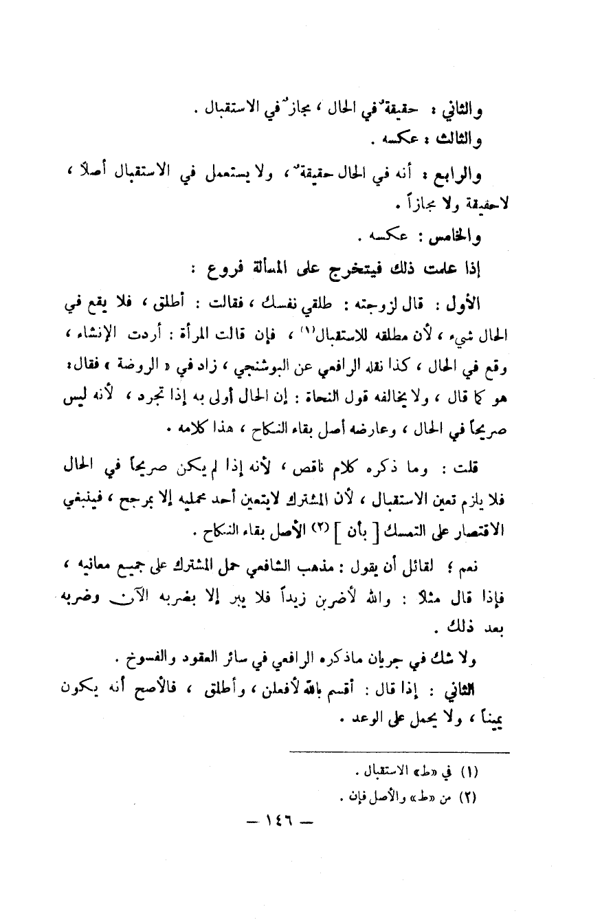 قلت وَمَا ذكره كَلَام نَاقص لِأَنَّهُ إِذا لم يكن صَرِيحًا فِي الْحَال فَلَا يلْزم تعين الِاسْتِقْبَال لِأَن الْمُشْتَرك لَا يتَعَيَّن أحد محمليه إِلَّا بمرجح فَيَنْبَغِي الِاقْتِصَار على التَّمَسُّك بِأَن الأَصْل بَقَاء النِّكَاح