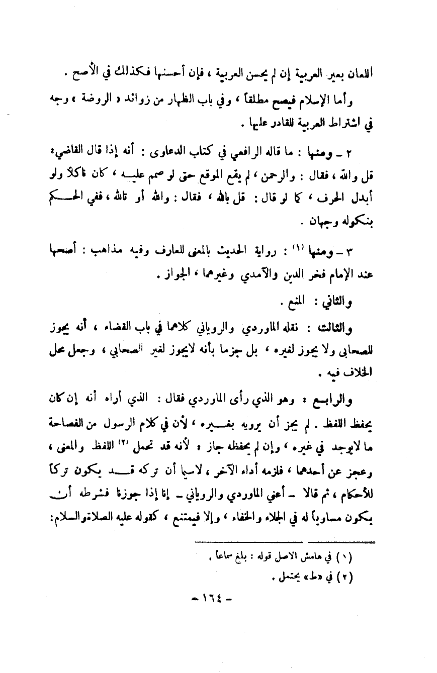 ٣ - وَمِنْهَا رِوَايَة الحَدِيث بِالْمَعْنَى للعارف وَفِيه مَذَاهِب أَصَحهَا عِنْد الإِمَام فَخر الدّين والآمدي وَغَيرهمَا الجوازا
