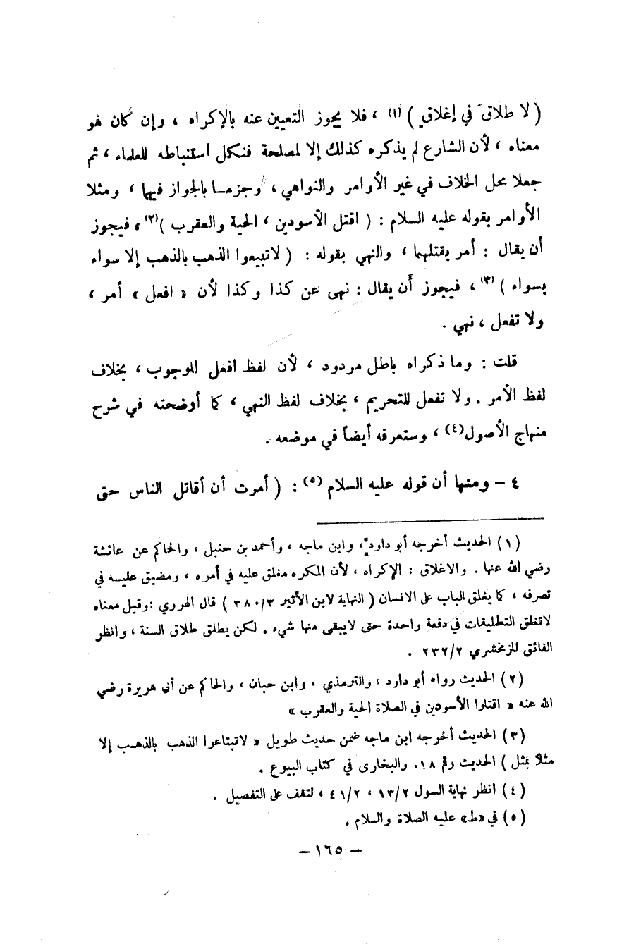 لَا طَلَاق فِي إغلاق فَلَا يجوز التَّعْيِين عَنهُ بِالْإِكْرَاهِ وَإِن كَانَ هُوَ مَعْنَاهُ لِأَن الشَّارِع لم يذكرهُ كَذَلِك إِلَّا لمصْلحَة فنكل استنباطه للْعُلَمَاء ثمَّ جعلا مَحل الْخلاف فِي غير الْأَوَامِر والنواهي وجزما بِالْجَوَازِ فيهمَا ومثلا الْأَوَامِر بقوله عَلَيْهِ السَّلَام اقْتُل الأسودين الْحَيَّة وَالْعَقْرَب فَيجوز أَن يُقَال أَمر بِقَتْلِهِمَا وَالنَّهْي بقوله لَا تَبِيعُوا الذَّهَب بِالذَّهَب إِلَّا سَوَاء بِسَوَاء فَيجوز أَن يُقَال نهى عَن كَذَا وَكَذَا لِأَن افْعَل أَمر وَلَا تفعل نهي
