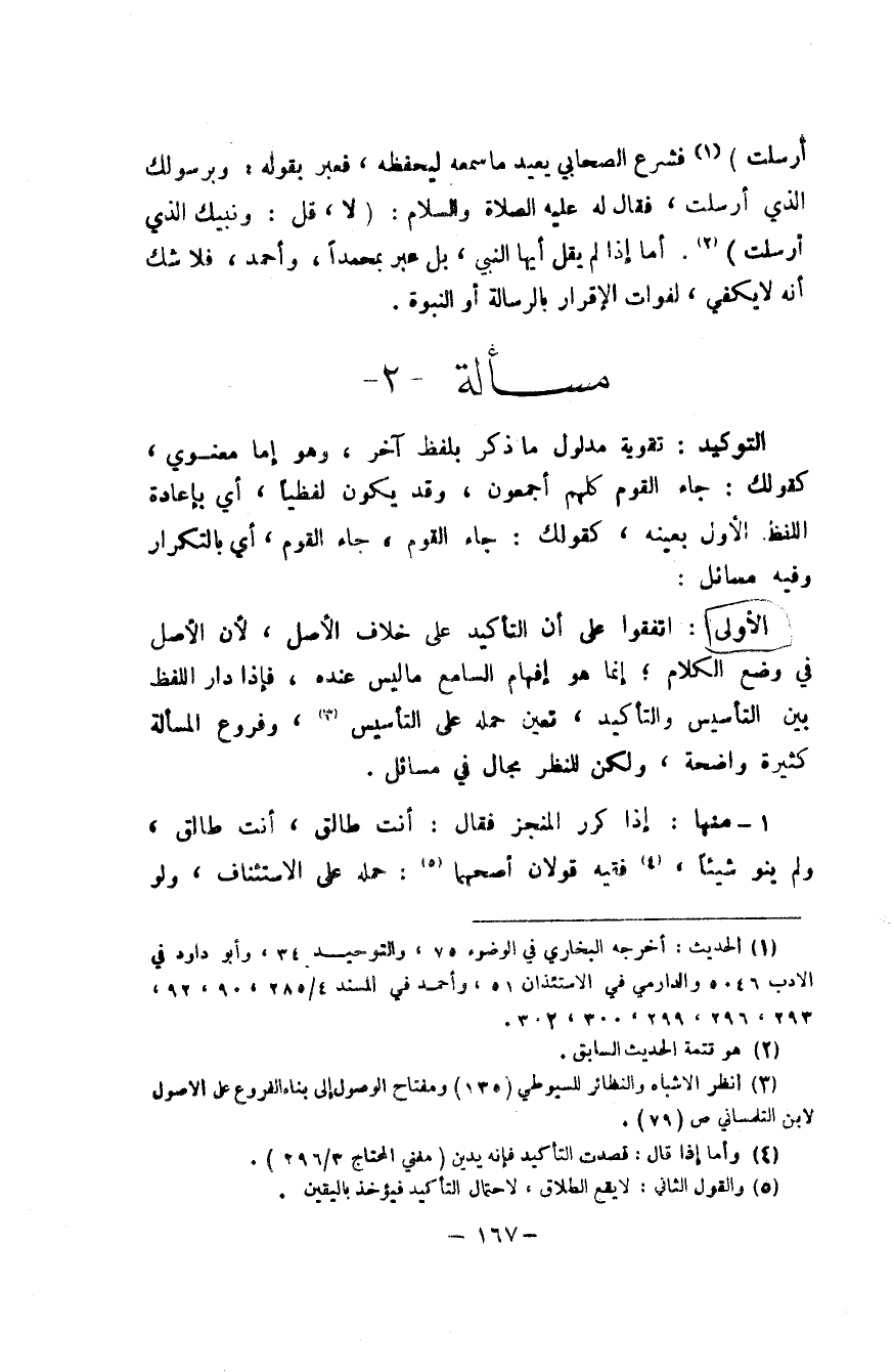 الأولى اتَّفقُوا على أَن التَّأْكِيد على خلاف الأَصْل لِأَن الأَصْل فِي وضع الْكَلَام إِنَّمَا هُوَ إفهام السَّامع مَا لَيْسَ عِنْده فَإِذا دَار اللَّفْظ بَين التأسيس والتأكيد تعين حمله على التأسيس وفروع الْمَسْأَلَة كَثِيرَة وَاضِحَة وَلَكِن للنَّظَر مجَال فِي مسَائِل