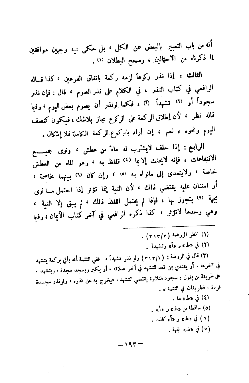 الثَّالِث إِذا نذر رُكُوعًا لزمَه رَكْعَة بِاتِّفَاق الفرعين كَذَا قَالَه الرَّافِعِيّ فِي كتاب النّذر فِي الْكَلَام على نذر الصَّوْم قَالَ فَإِن نذر سجودا أَو تشهدا فَكَمَا لَو نذر أَن يَصُوم بعض الْيَوْم وَفِيمَا قَالَه نظر لِأَن إِطْلَاق الرَّكْعَة على الرُّكُوع مجَاز بِلَا شكّ فَيكون كَنِصْف الْيَوْم وَنَحْوه نعم إِن أَرَادَ بِالرُّكُوعِ الرَّكْعَة الْكَامِلَة فَلَا إِشْكَال