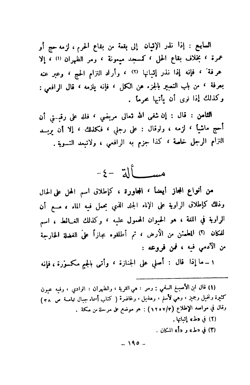 السَّابِع إِذا نذر الْإِتْيَان إِلَى بقْعَة من بقاع الْحرم لزمَه حج اَوْ عمْرَة بِخِلَاف بقاع الْحل كمسجد مَيْمُونَة وَمر الظهْرَان إِلَّا عَرَفَة فَإِنَّهُ إِذا نذر إتيانها وَأَرَادَ الْتِزَام الْحَج وَعبر عَنهُ بِعَرَفَة من بَاب التَّعْبِير بالجزء عَن الْكل فَإِنَّهُ يلْزمه قَالَ الرَّافِعِيّ وَكَذَلِكَ إِذا نوى أَن يَأْتِيهَا محرما