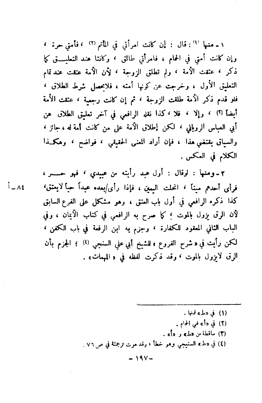 ١ - مِنْهَا قَالَ إِن كَانَت امْرَأَتي فِي المأتم فأمتي حرَّة وَإِن كَانَت أمتِي فِي الْحمام فامرأتي طَالِق وكانتا عِنْد التَّعْلِيق كَمَا ذكر عتقت الْأمة وَلم تطلق الزَّوْجَة لِأَن الْأمة عتقت عِنْد تَمام التَّعْلِيق الأول وَخرجت عَن كَونهَا أمته فَلَا يحصل شَرط الطَّلَاق فَلَو قدم ذكر الْأمة طلقت الزَّوْجَة ثمَّ إِن كَانَت رَجْعِيَّة عتقت الْأمة أَيْضا وَإِلَّا فَلَا كَذَا نَقله الرَّافِعِيّ فِي آخر تَعْلِيق الطَّلَاق عَن أبي الْعَبَّاس الرَّوْيَانِيّ لَكِن إِطْلَاق الْأمة على من كَانَت أمة لَهُ جَائِز والسياق يَقْتَضِي هَذَا فَإِن أَرَادَ الْمَعْنى الْحَقِيقِيّ فَوَاضِح وَهَكَذَا الْكَلَام فِي الْعَكْس