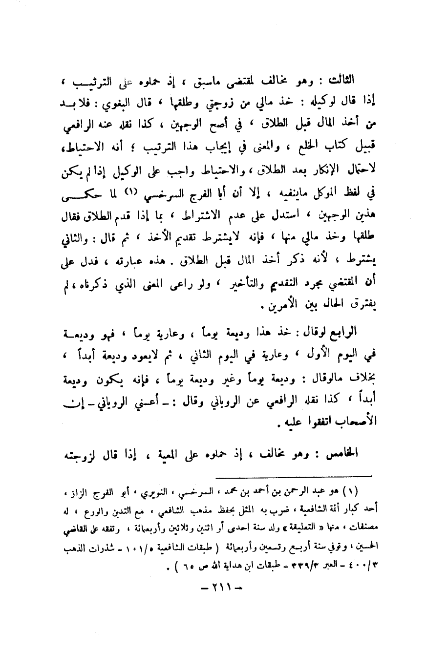 الثَّالِث وَهُوَ مُخَالف لمقْتَضى مَا سبق إِذا حملوه على التَّرْتِيب إِذا قَالَ لوَكِيله خُذ مَالِي من زَوْجَتي وَطَلقهَا قَالَ الْبَغَوِيّ فَلَا بُد من أَخذ المَال قبل الطَّلَاق فِي أصح الْوَجْهَيْنِ كَذَا نَقله عَنهُ الرَّافِعِيّ قبيل كتاب الْخلْع والمعني فِي إِيجَاب هَذَا التَّرْتِيب أَنه الِاحْتِيَاط لاحْتِمَال الْإِنْكَار بعد الطَّلَاق وَالِاحْتِيَاط وَاجِب على الْوَكِيل إِذا لم يكن فِي لفظ الْمُوكل مَا يَنْفِيه إِلَّا أَن أَبَا الْفرج السَّرخسِيّ لما حكى هذَيْن الْوَجْهَيْنِ اسْتدلَّ على عدم الِاشْتِرَاط بِمَا إِذا قدم الطَّلَاق فَقَالَ طَلقهَا وَخذ مَالِي مِنْهَا فَإِنَّهُ لَا يشْتَرط تَقْدِيم الْأَخْذ ثمَّ قَالَ وَالثَّانِي يشْتَرط لِأَنَّهُ ذكر أَخذ المَال قبل الطَّلَاق هَذِه عِبَارَته فَدلَّ على أَن الْمُقْتَضِي مُجَرّد التَّقْدِيم وَالتَّأْخِير وَلَو رَاعى الْمَعْنى الَّذِي ذَكرْنَاهُ لم يفْتَرق الْحَال بَين الْأَمريْنِ