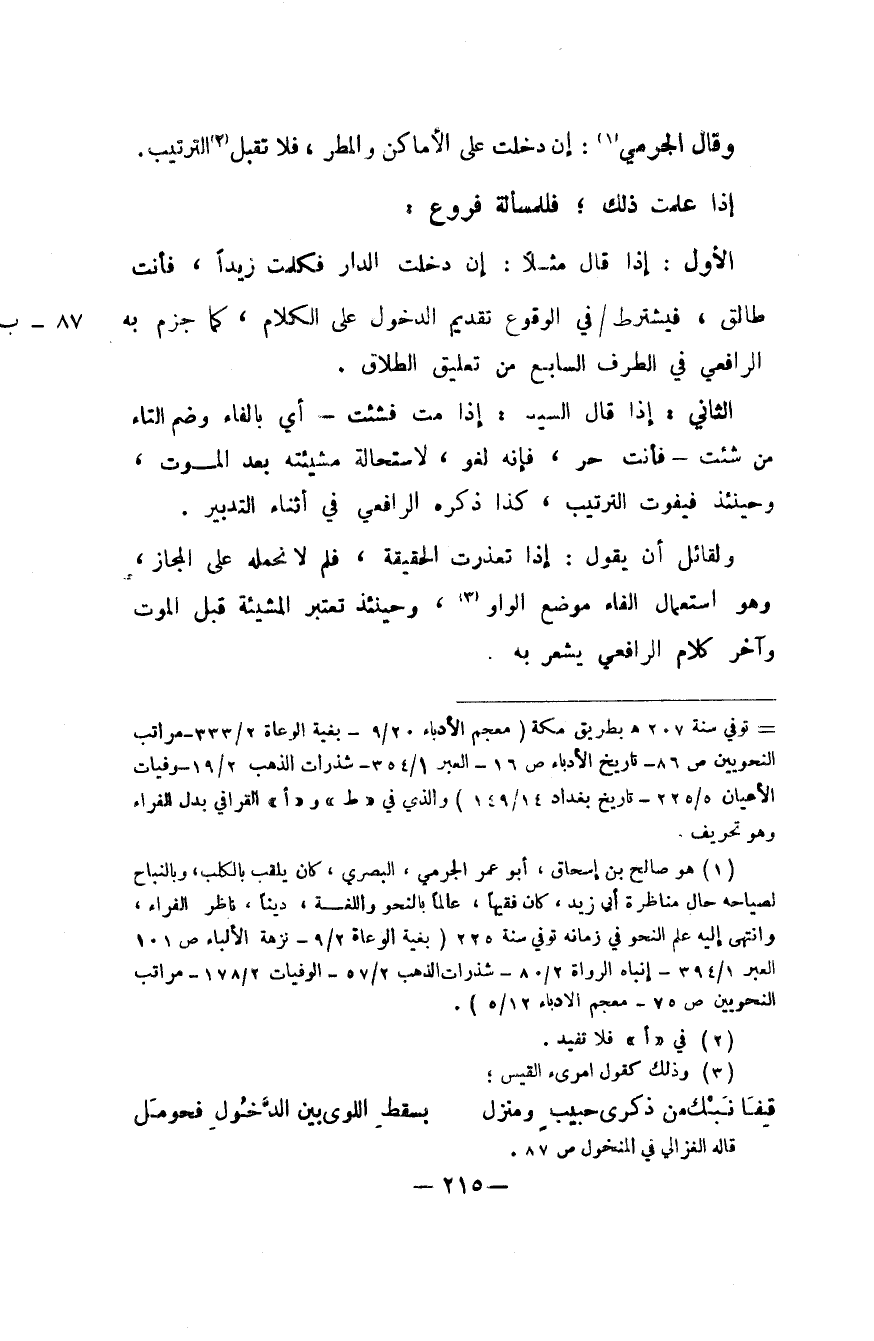 الأول إِذا قَالَ مثلا إِن دخلت الدَّار فكلمت زيدا فَأَنت طَالِق فَيشْتَرط فِي الْوُقُوع تَقْدِيم الدُّخُول على الْكَلَام كَمَا جزم بِهِ الرَّافِعِيّ فِي الطّرف السَّابِع من تَعْلِيق الطَّلَاق