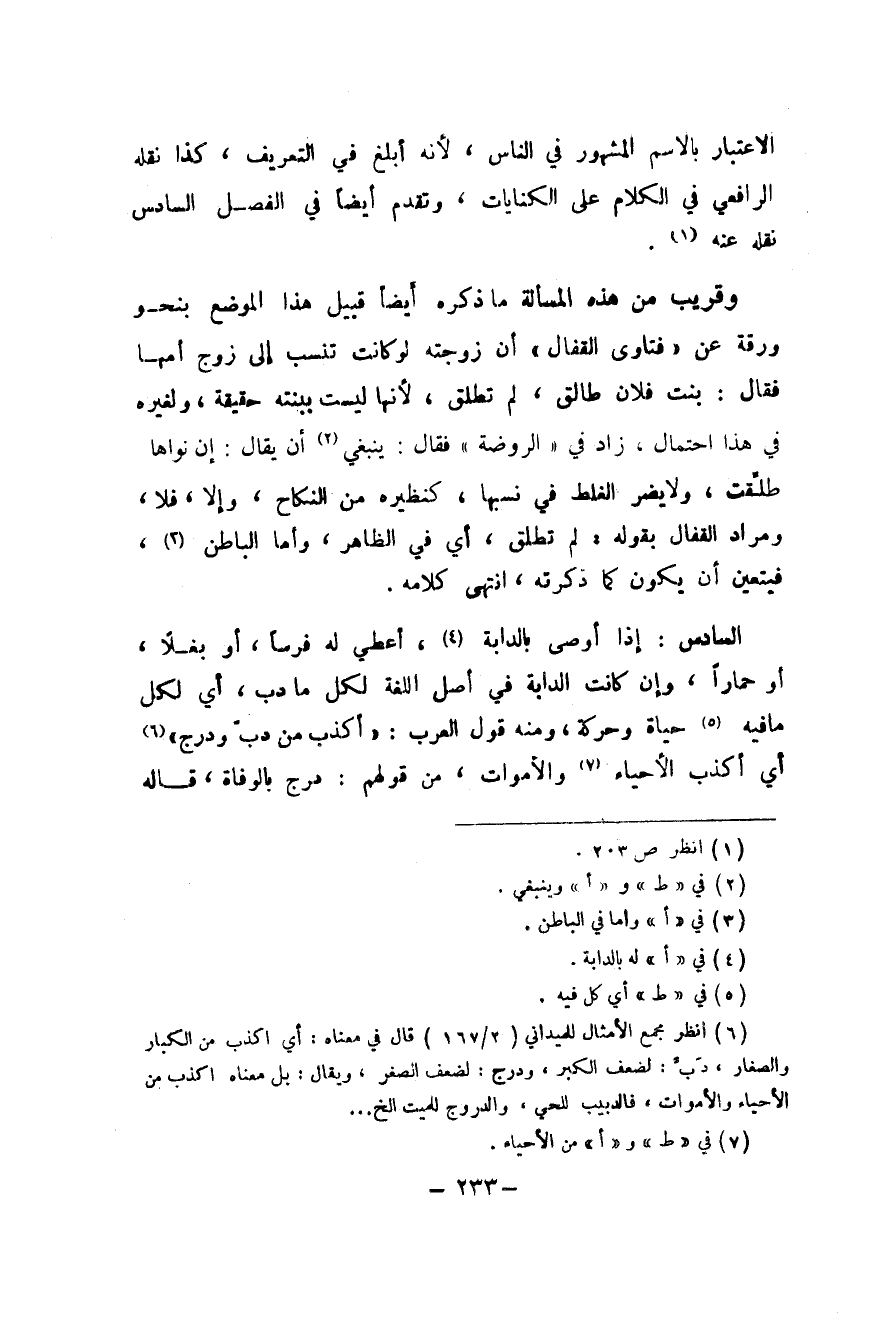 الِاعْتِبَار بِالِاسْمِ الْمَشْهُور فِي النَّاس لِأَنَّهُ ابلغ فِي التَّعْرِيف كَذَا نَقله الرَّافِعِيّ فِي الْكَلَام على الْكِنَايَات وَتقدم أَيْضا فِي الْفَصْل السَّادِس نَقله عَنهُ